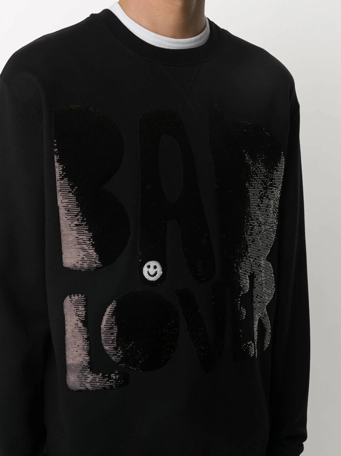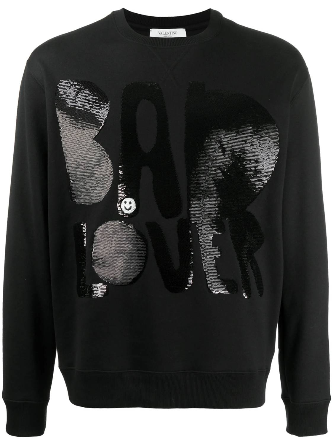 Elevate your fall wardrobe with the Bad Lover Sequin Sweatshirt by Valentino, a striking piece in classic black. This sweatshirt boasts long sleeves and a ribbed hem, with a round neck for a comfortable fit. Crafted from a luxurious cotton blend, the composition includes 100% Polyester, 94% Cotton, and 6% Polyamide, embodying Italian craftsmanship. Closure: Pull-on. Care instructions recommend dry cleaning to maintain its pristine condition. Model is 1.86 m tall and wears a size M.