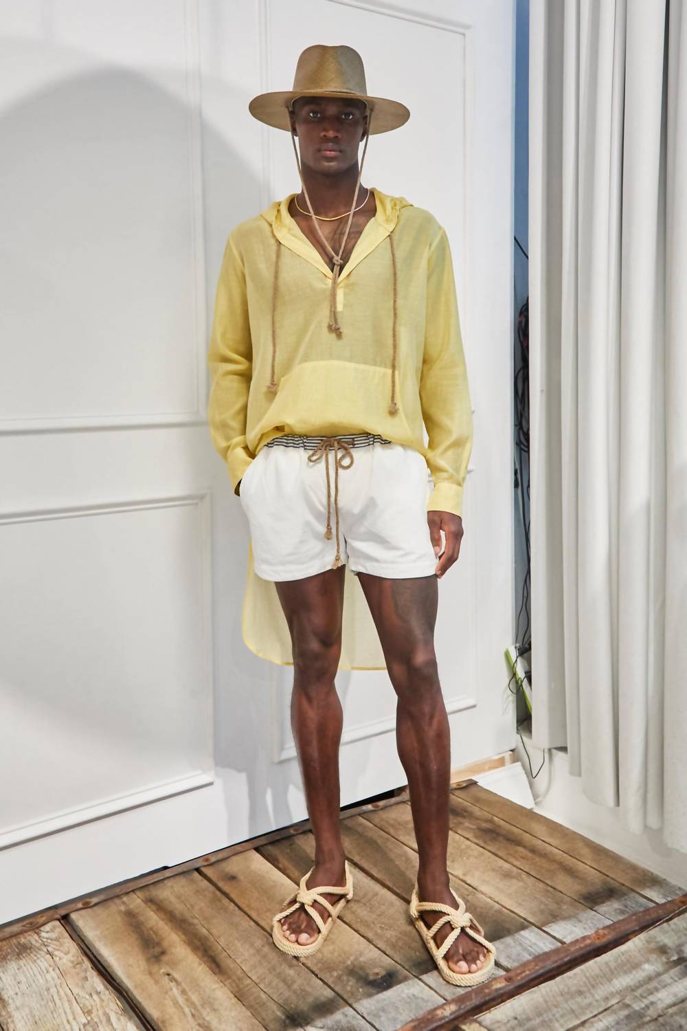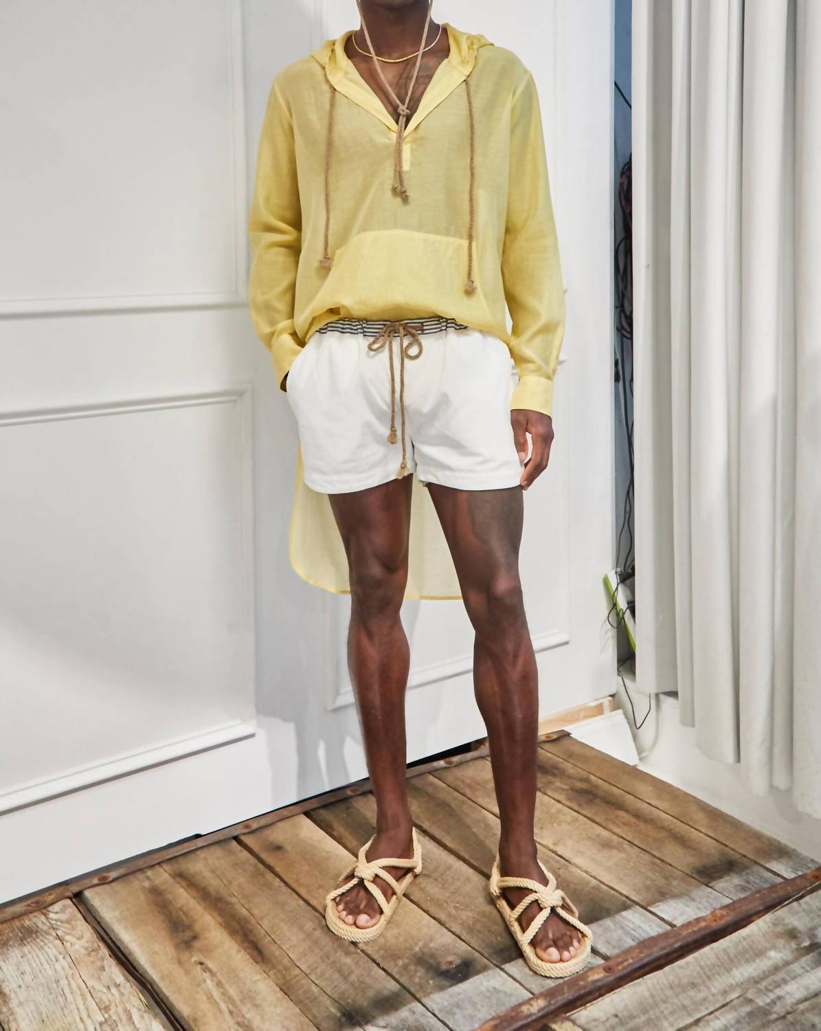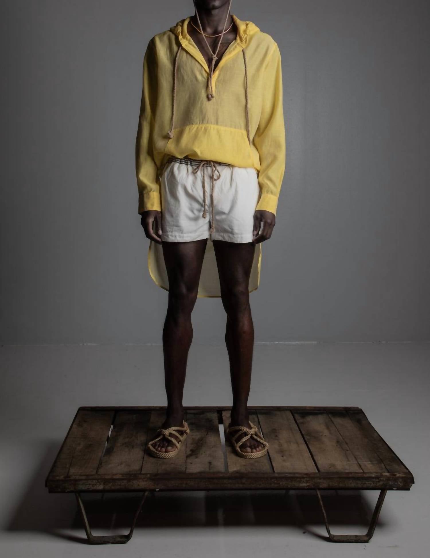 Meet the Men's Hoodie Tunic by thesalting, a chic addition to any summer wardrobe with its vibrant sun yellow hue. This long sleeve tunic, crafted from a premium blend of 60% cotton and 40% silk, features a semi-sheer texture for a lightweight feel, perfect as a swimsuit cover-up. Made in America, it offers a distinctive kangaroo pocket, self-hood with signature Japanese drawstring, and a curved hi-lo hem with double side-slits. The garment length is below the knee at the front and mid-calf at the back, and it closes with a pull-on design. For care, please dry clean only and soft press. Nixon is 6'2" and wears a size 1.
