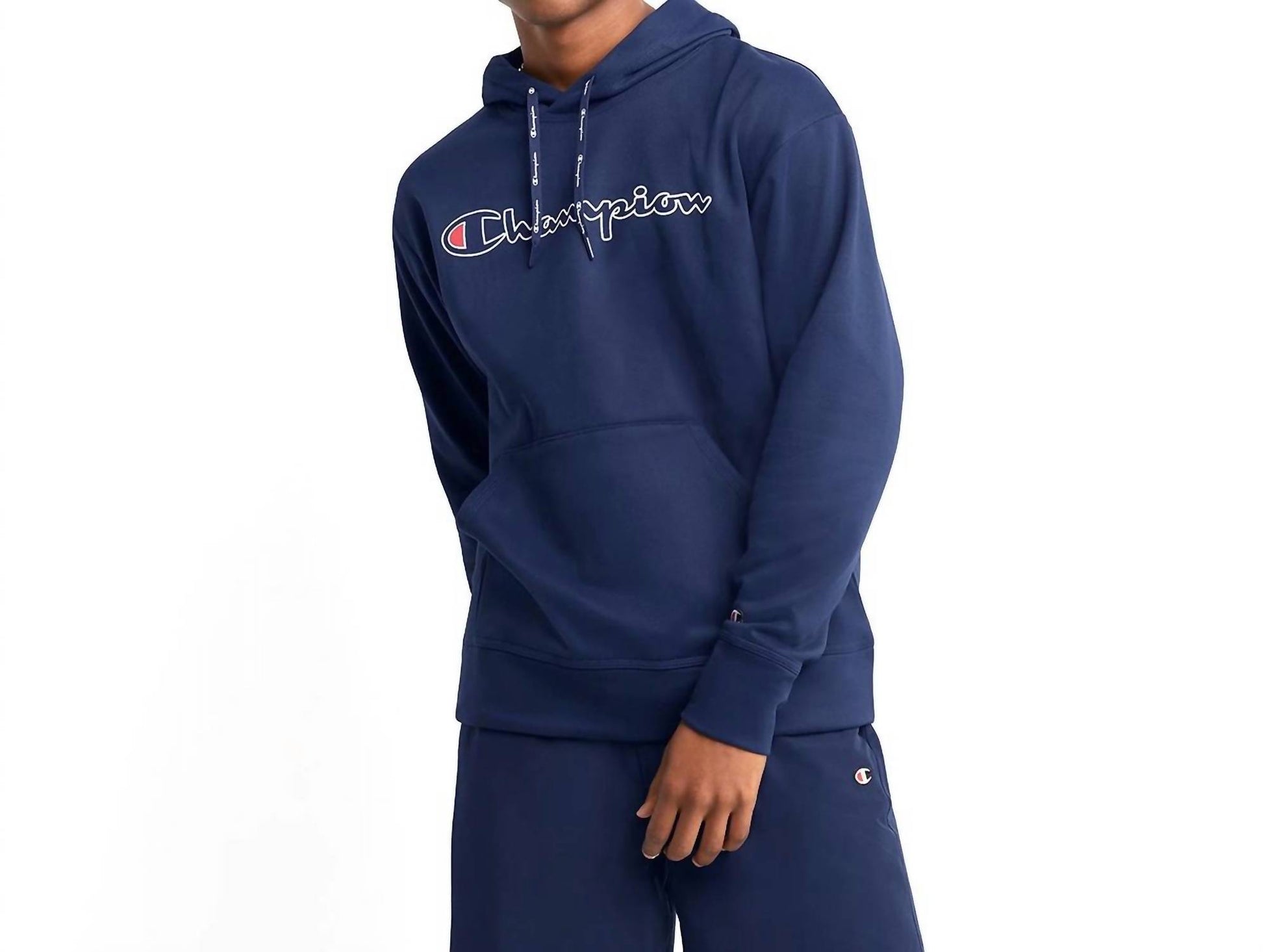 KEEP YOUR COOL For serious working out or not-so-serious hanging out, choose this stretch logo hoodie. This light hooded sweatshirt is made from a comfortable blend that's been brushed for softness and stretches with you. The best thing about this Game Day style is the moisture-wicking fabric that keeps you cool and dry no matter what you're doing. With a classic fit, this effortless design is detailed with a contrast drawcord hood, an essential kangaroo pocket, ribbed cuffs with stay-in-place thumb slits and a ribbed hem. Proudly displaying a signature Champion script logo across the chest, this hoodie is finished with an iconic C at the sleeve for authentic styling.