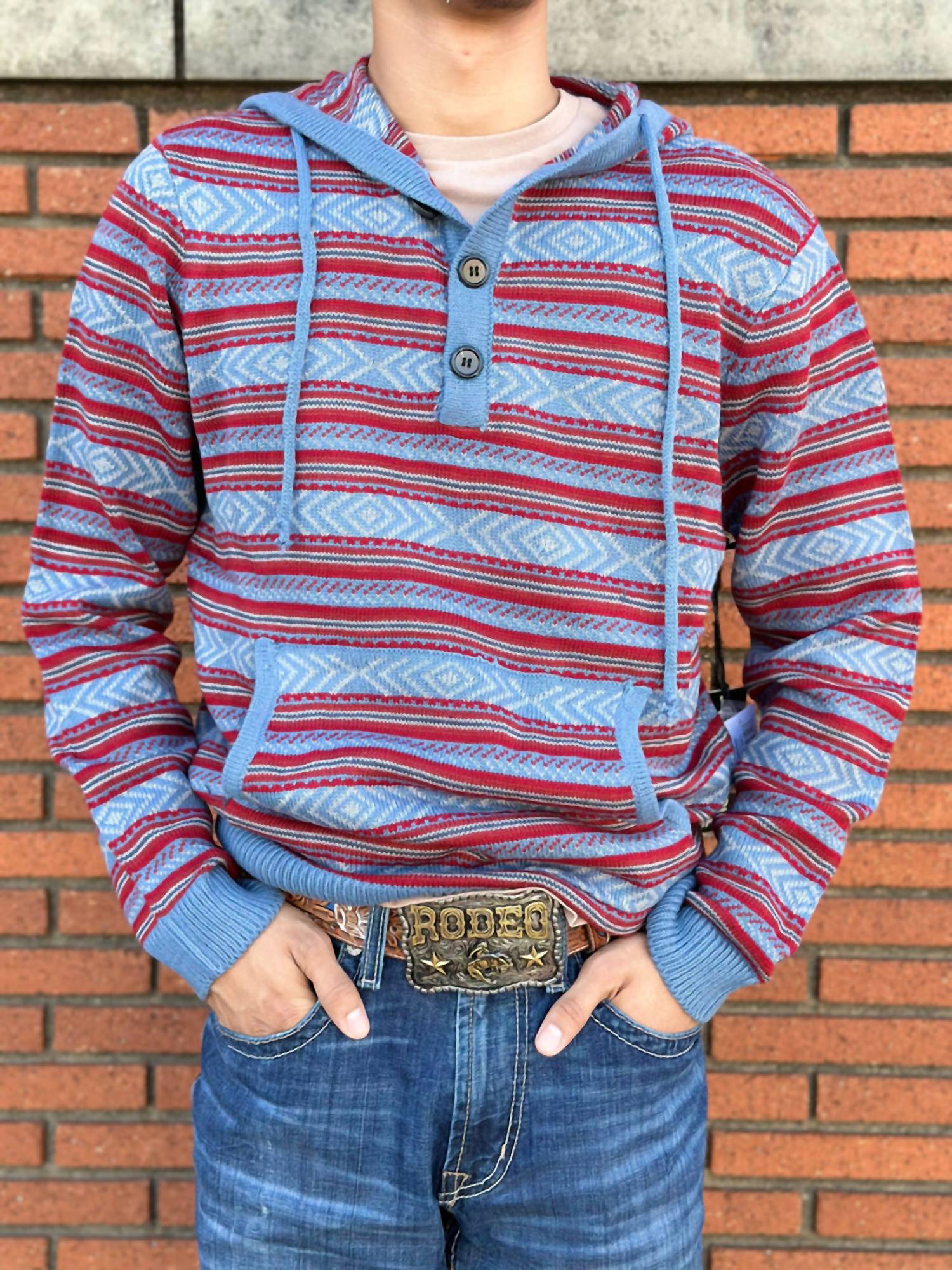 Elevate your fall wardrobe with the Rock & Roll Denim Sweater Hoodie, an essential for any vacation with its boho chic flair. Designed for men, this patterned hoodie features long sleeves, crafted from durable Acrylic material. Closure: Button closure. Embrace style and practicality with convenient pockets and a hooded neckline.
