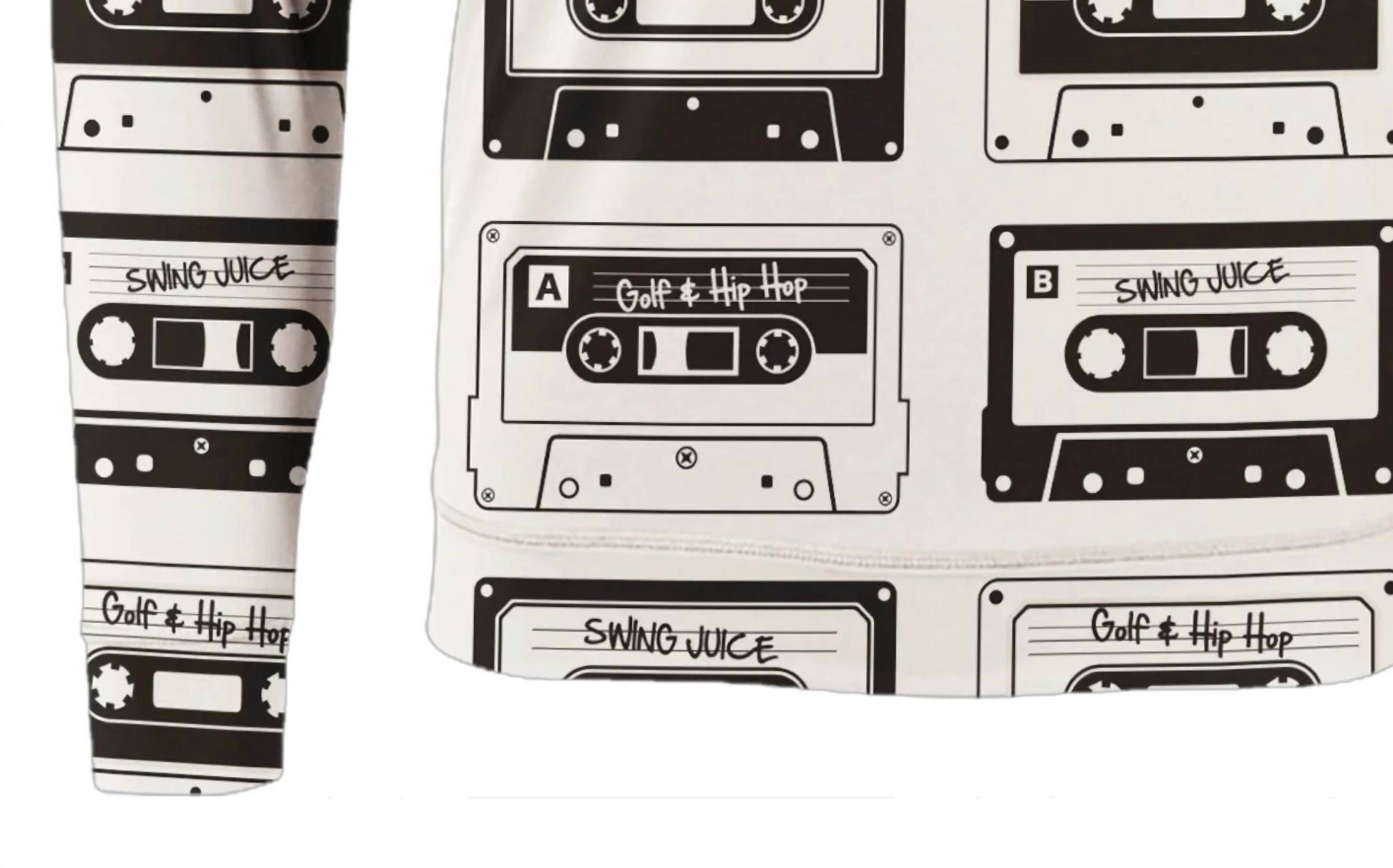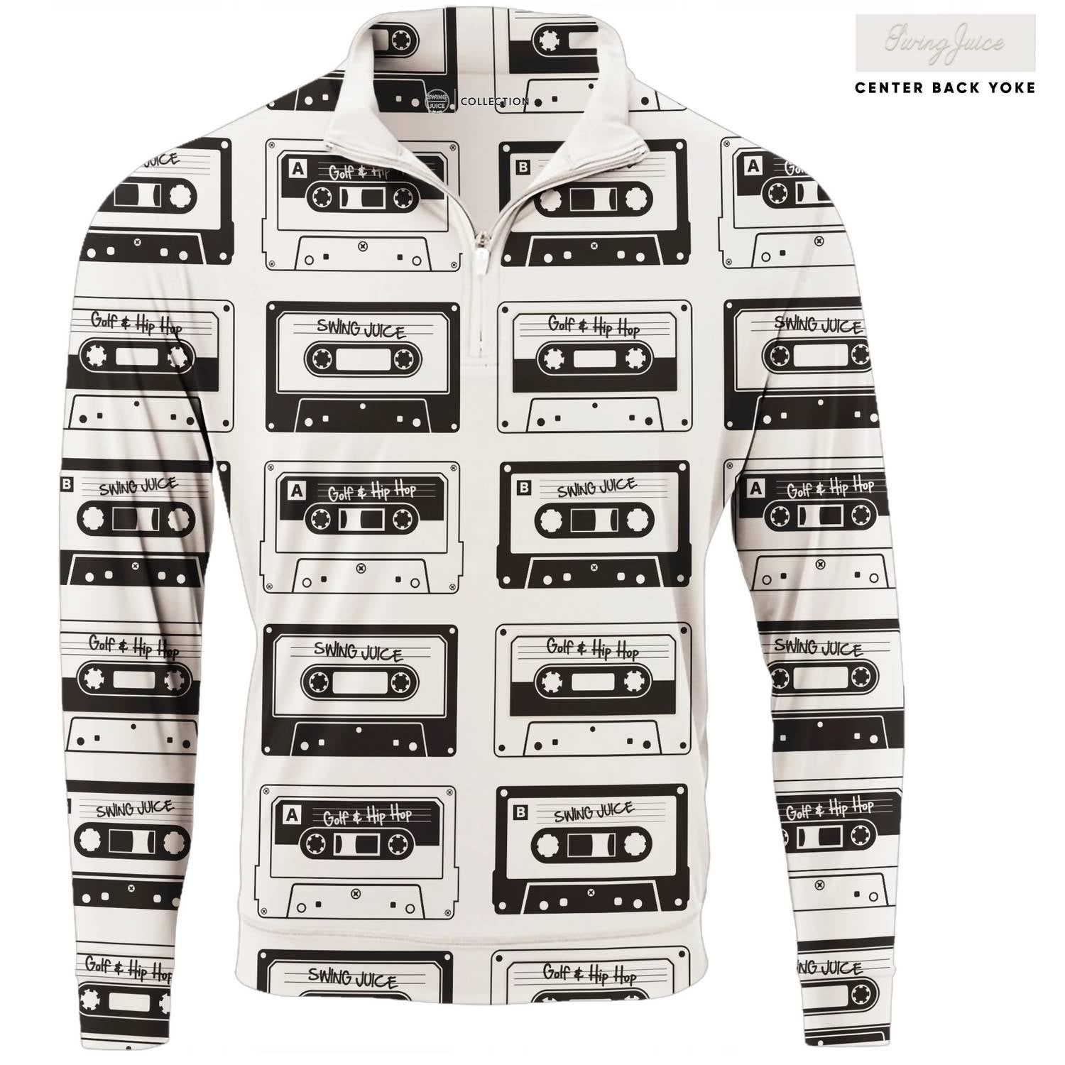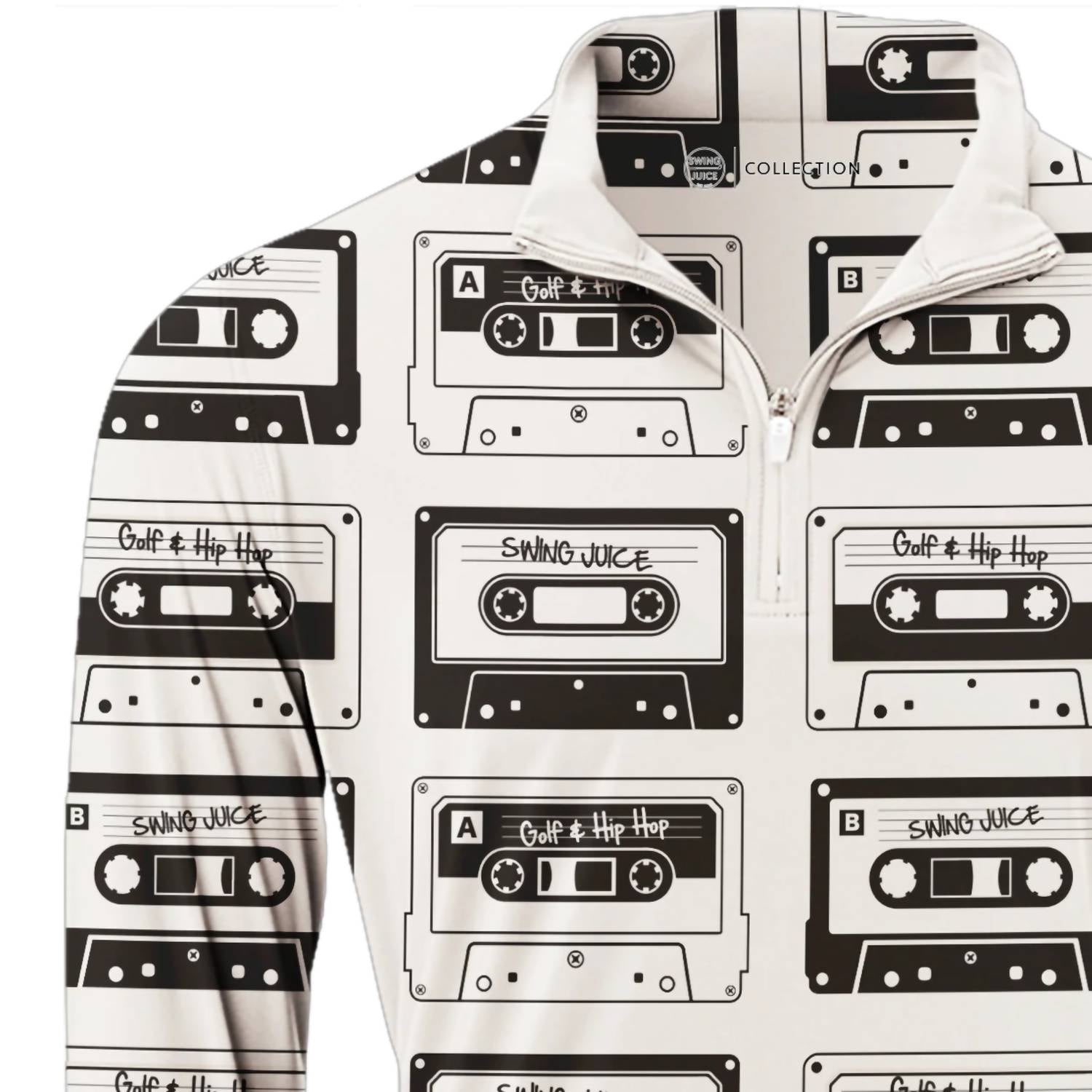 Introducing the Men's Golf Mixtape Quarter Zip Sweatshirt by SwingJuice in a standout ivory hue. This long-sleeve piece showcases a retro mixtape print with "Golf & Hip Hop" and "SwingJuice" details, crafted from bamboo charcoal-infused micro polyester for both style and comfort. Composition: 92% micro poly, 8% Spandex. Closure: 1/4 zip with a top zip pocket. Care: Machine wash cold, tumble dry low. Enjoy the added benefits of quick-dry properties, UPF 50+ sun protection, and natural odor resistance, perfect for a preppy spring travel ensemble.