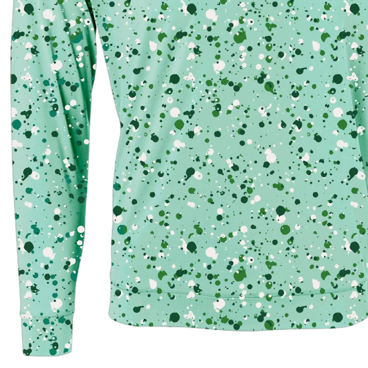 Unleash your artistic side with the Men's Golf Splatter Quarter Zip Sweatshirt by SwingJuice, designed in a refreshing mint color. This long-sleeve sweatshirt features a modern art-inspired splatter design and a practical 1/4 zip with a top zip pocket for added convenience. The bamboo charcoal-infused micro polyester, blended with 8% spandex, offers breathability and natural odor resistance, ensuring comfort with a preppy flair. Care for this garment is straightforward with machine wash cold and tumble dry low instructions, making it a versatile addition to your spring wardrobe, especially for Father's Day or vacation occasions.