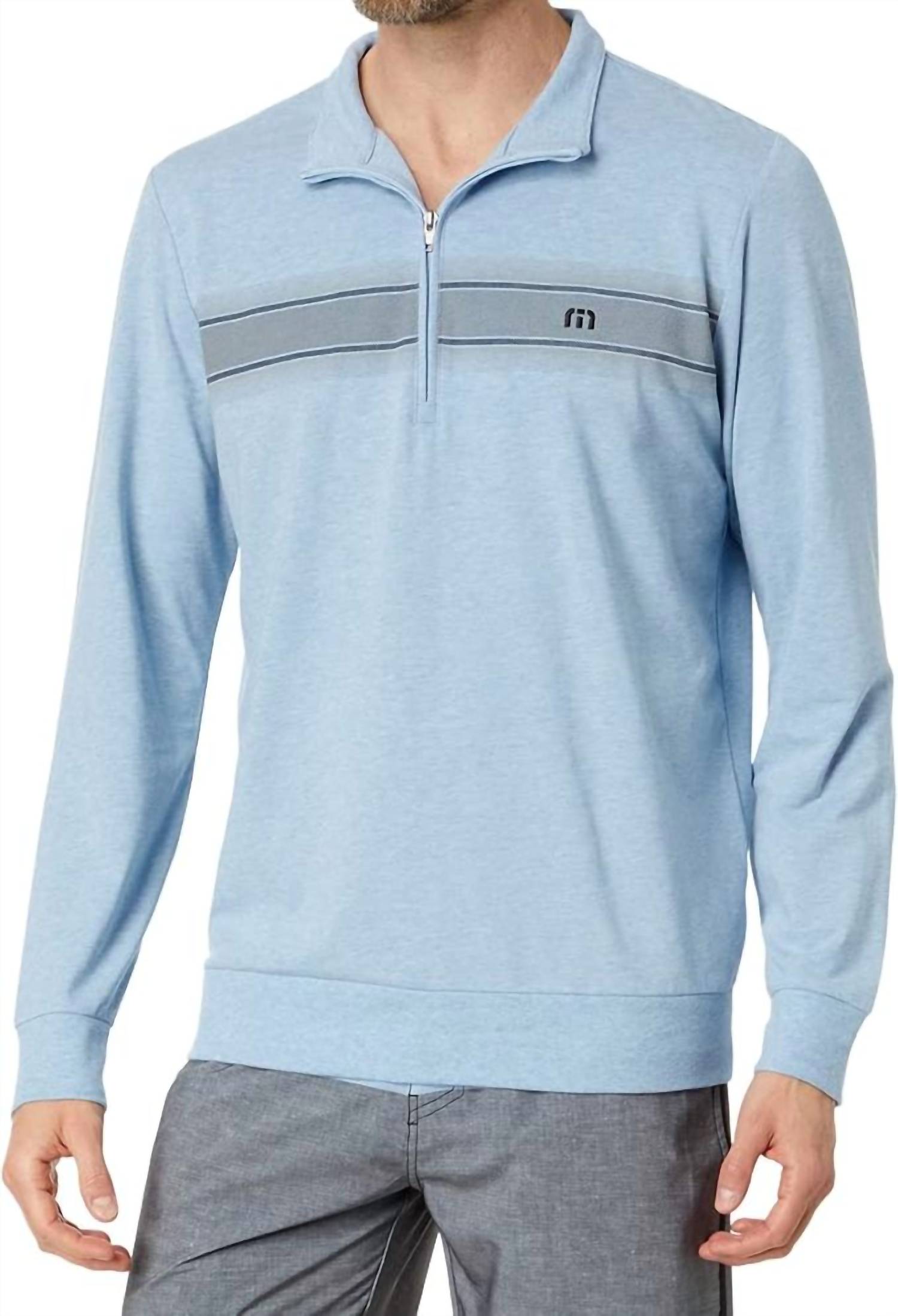 Introducing the TravisMathew Tequila Sour Pullover, a stylish addition to your fall athleisure wardrobe in Heather Bel Air Blue. This men's sweatshirt features a long sleeve design and a modern mockneck, crafted from a comfortable 58% cotton, 32% polyester, 10% elastane blend. The pullover offers a convenient zip closure and boasts a graphic pattern for a touch of flair. Care instructions are simple: machine wash and tumble dry for easy maintenance.