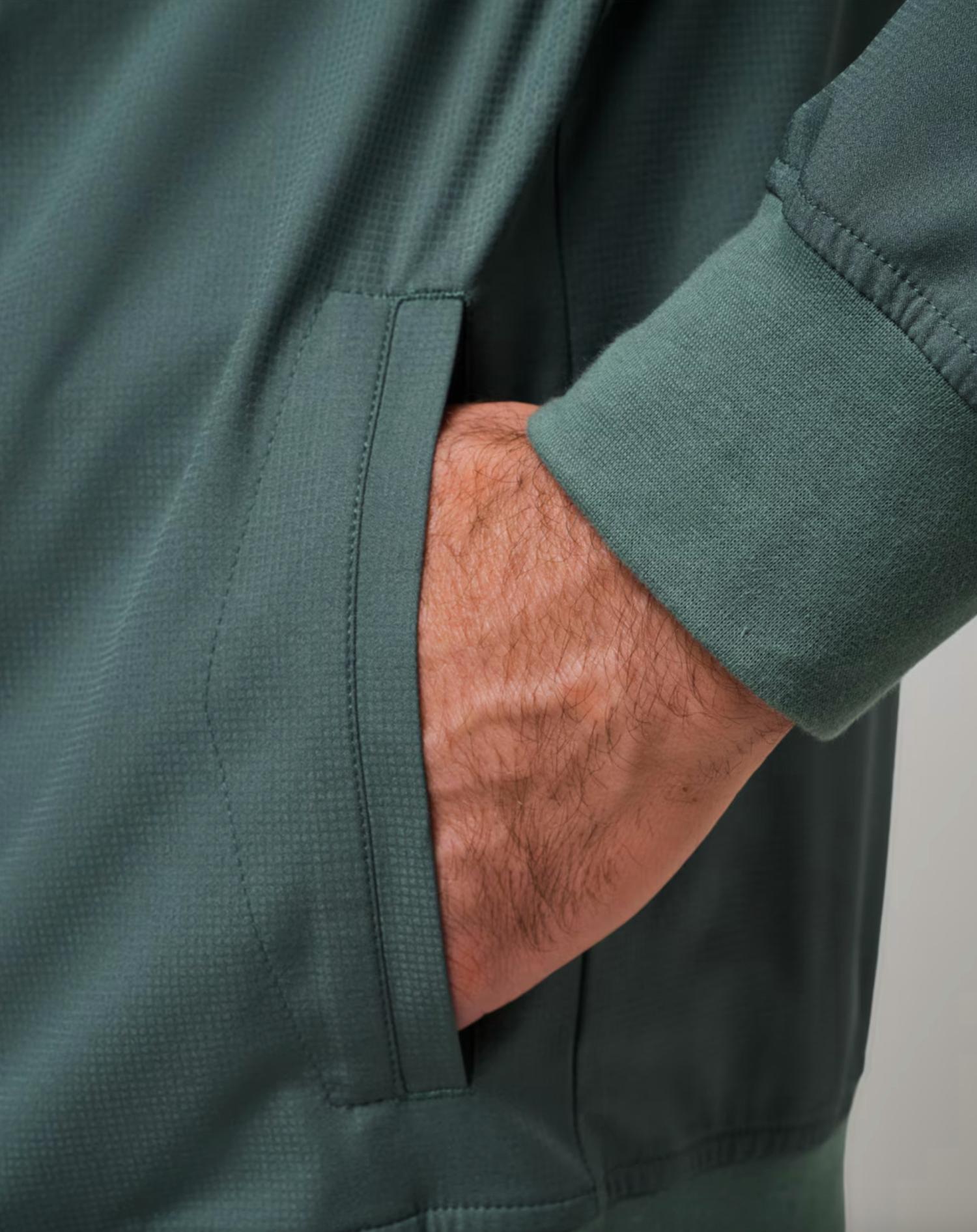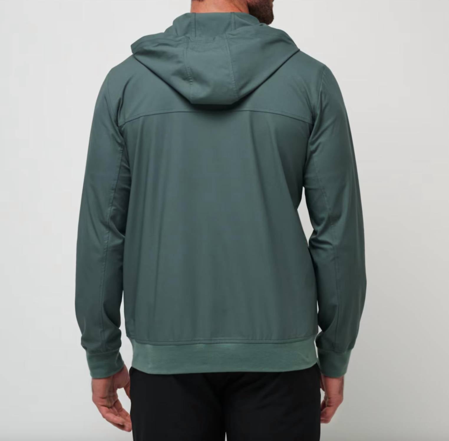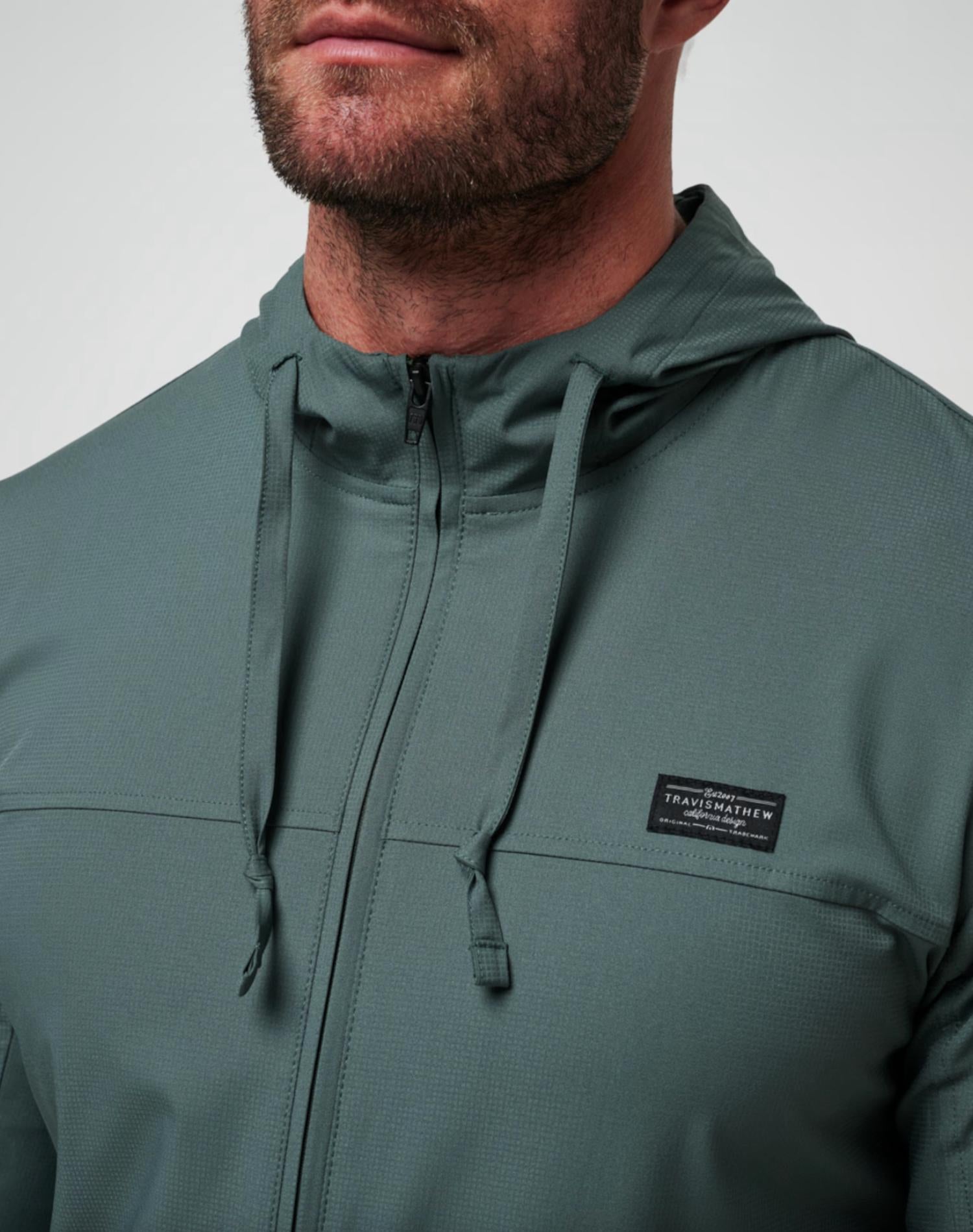 Experience the ultimate in style and durability with the TravisMathew Wanderlust Hoodie in green. This long-sleeve hoodie features a practical zip closure and uses a Polyester/Spandex blend for dynamic 4-way stretch. Designed with micro-ripstop technology, it's perfect for various activities, from fitness to casual outings. The solid pattern and hooded neckline make it a versatile choice for any wardrobe.