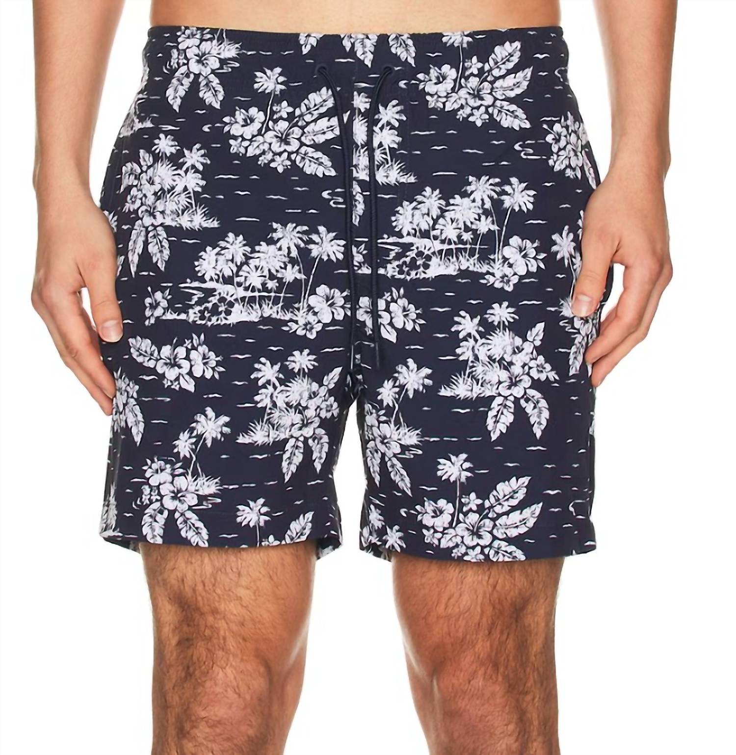 Dive into summer with Onia's Tropical Vista Comfort Lined Swim Trunks in an eye-catching Deep Teal/White floral print. Crafted from 100% Polyester, these mid-length swim trunks feature an elasticated drawstring waist and multipocket design for ultimate functionality. The pull-on style makes them easy to wear, ensuring comfort and style at the beach. Care instructions recommend hand washing and line drying to maintain the vibrant look of this boho-chic piece.