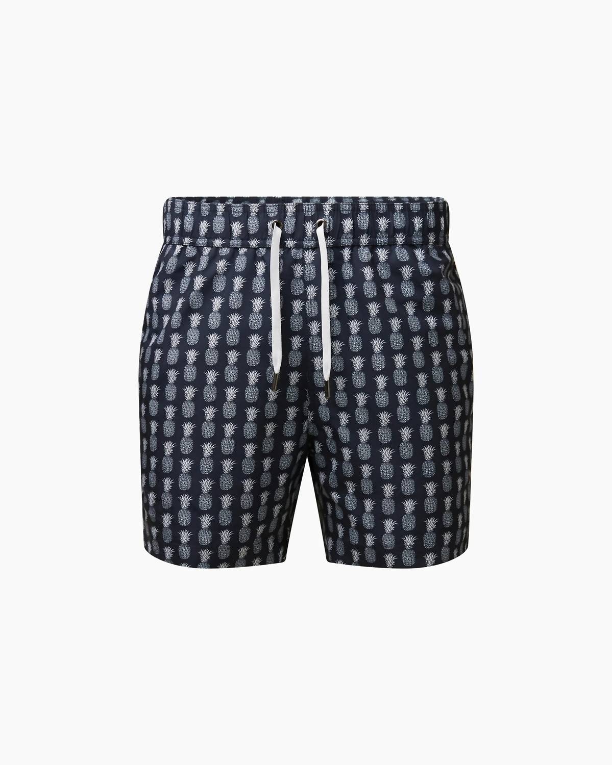 Dive into summer with the Onia Charles Swim Trunks in a playful Geo Pineapples print, perfect for any beach day. These mid-rise trunks are crafted from 100% polyester, featuring a lightweight, non-stretch technical weave. The swim bottoms include on-seam hip pockets, a zip back pocket, a covered elastic waist with a drawstring, and a 5-inch inseam for classic coverage. Imported from China, they should be hand washed and line dried to maintain their vibrant look. Measurements for size M are a rise of 12.25 inches, inseam of 5 inches, and outseam of 16.25 inches.