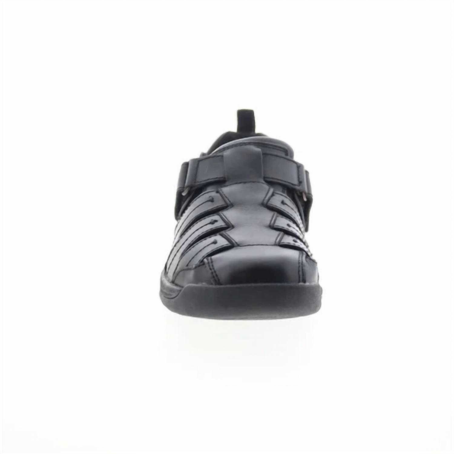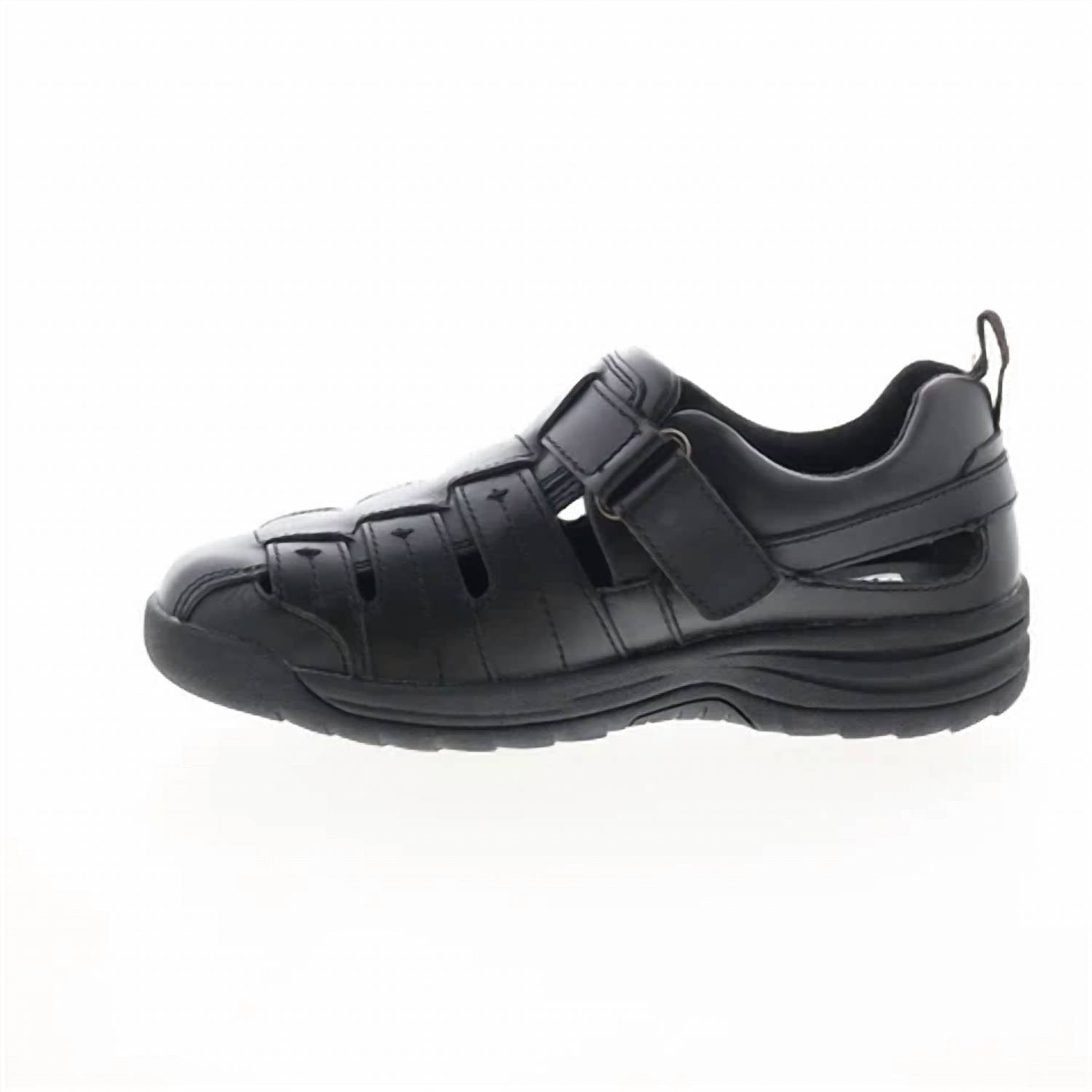 The Men's Dublin Sandals by Drew Shoes in classic black offer both comfort and support, featuring a cushioned, removable EVA footbed with memory foam. Made from durable leather, these sandals include a flexible, shock-absorbing rubber outsole and a tempered steel shank for stability. With two adjustable hook and loop closures, they provide customizability and accommodate prescribed orthotics, boasting a unique double depth design. Ideal for adult men, they have a low 1.25-inch flat heel and a wide round toe shape.