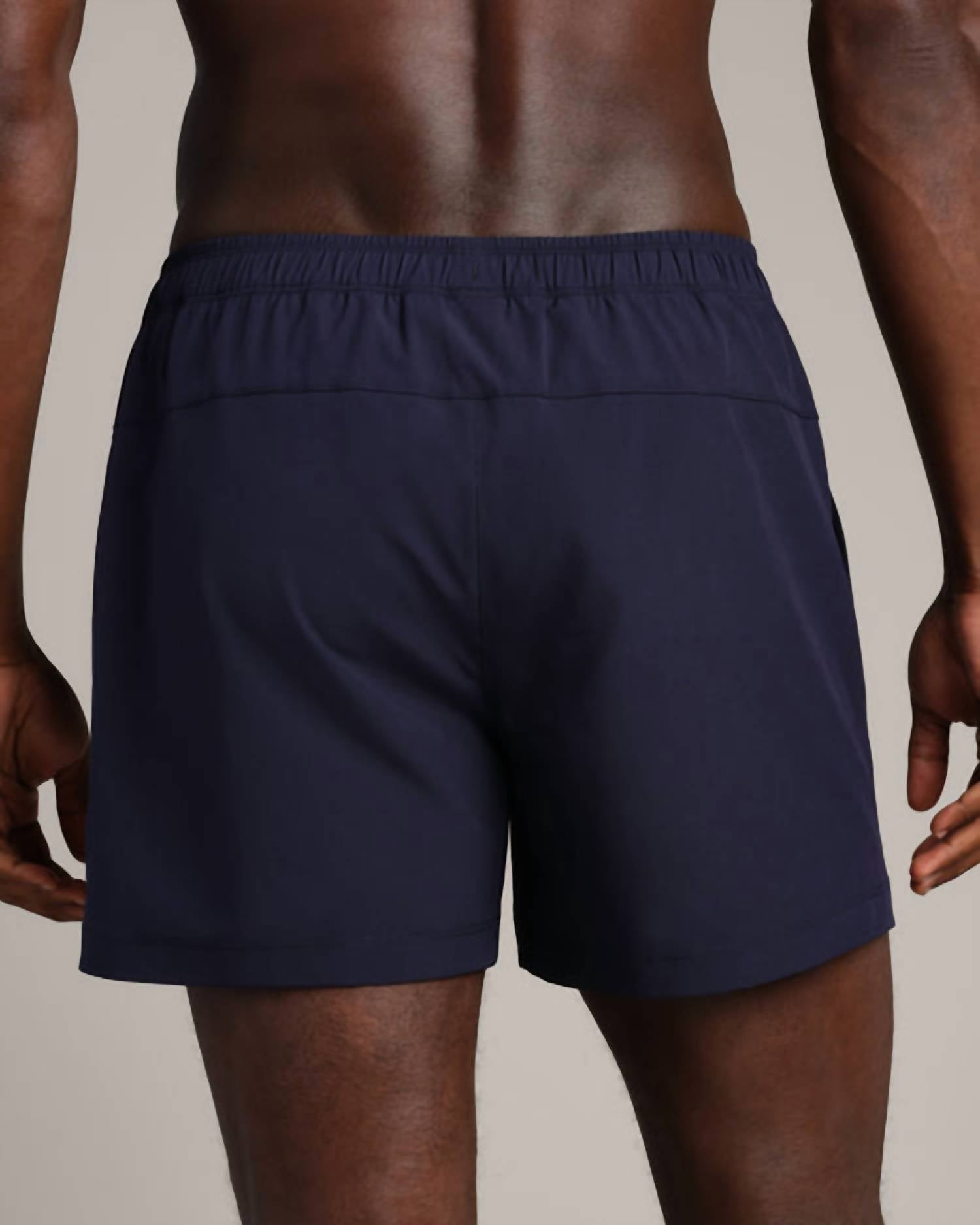 Experience ultimate comfort and versatility with the R&R Swim Trunk by Rhone, designed for the modern minimalist. Featuring a mid-rise silhouette, these swim trunks in navy are crafted with 92% recycled polyester and 8% elastane for a 4-way stretch and a solid, durable construction enhanced with DWR treated fabric. The trunks include an elastic waist and an exterior drawcord, complemented by a comfortable mesh boxer brief liner and a secure back pocket zipper. For care, wash inside out in cold water with like colors and line dry only; avoid bleach, tumble drying, ironing, dry cleaning, or fabric softeners.