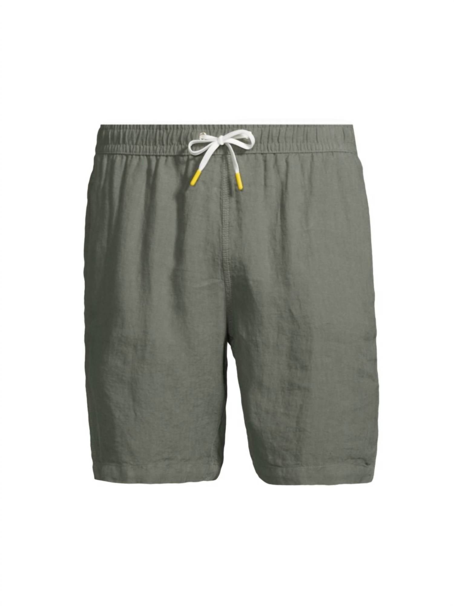 Introducing the Army Swim Short by Hartford, a versatile summer essential in a sophisticated grey hue. Crafted from 100% linen harvested in France and woven in Europe, these long-length board shorts are lightweight, breathable, and designed for utmost comfort. With an elastic waistband featuring contrasting drawstrings, side pockets, and a back pocket, they function as both swimwear and casual shorts. Made in Morocco, these shorts should be hand washed and line dried for optimal care. The model is 6'2" and wears a size M.