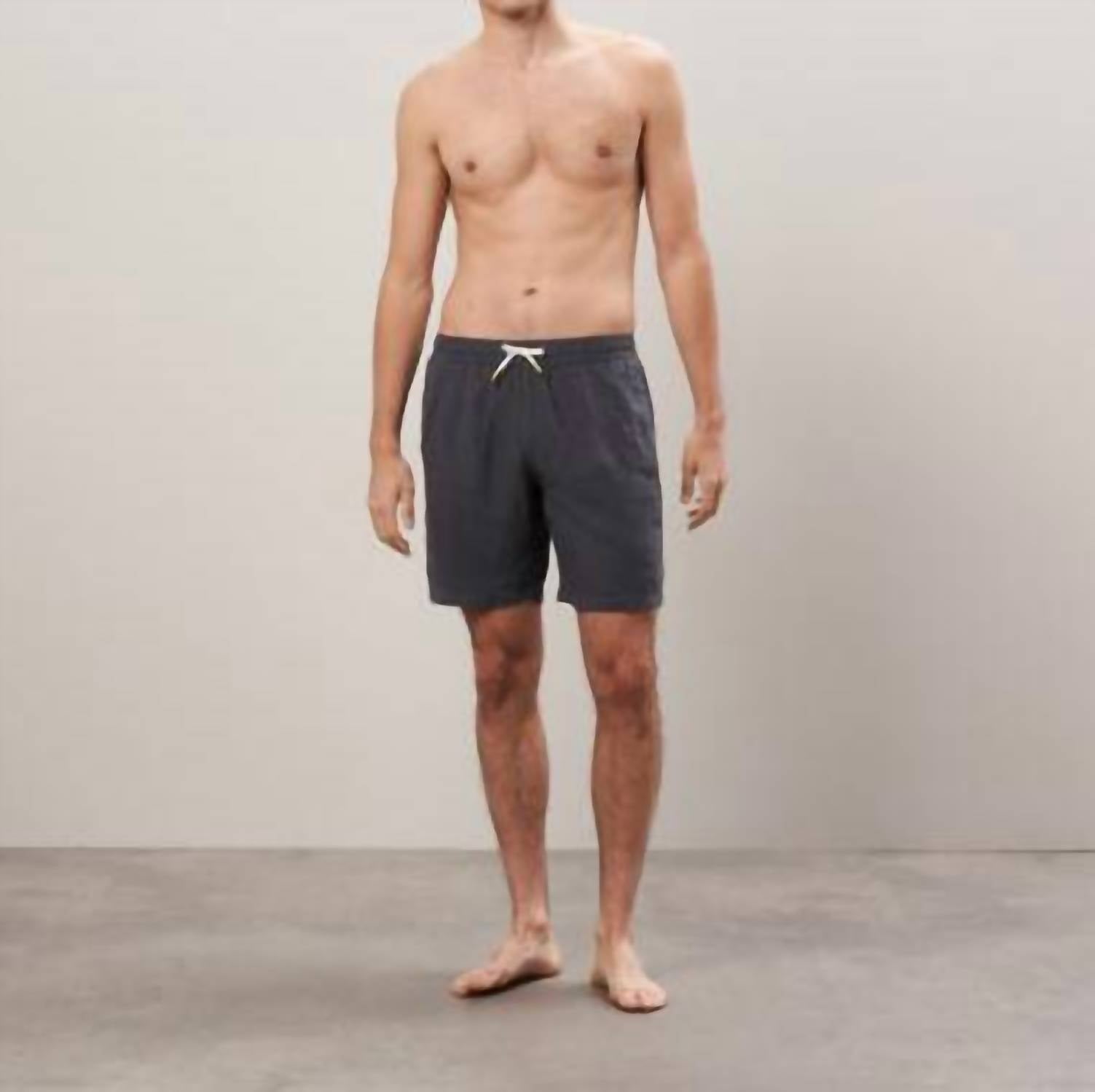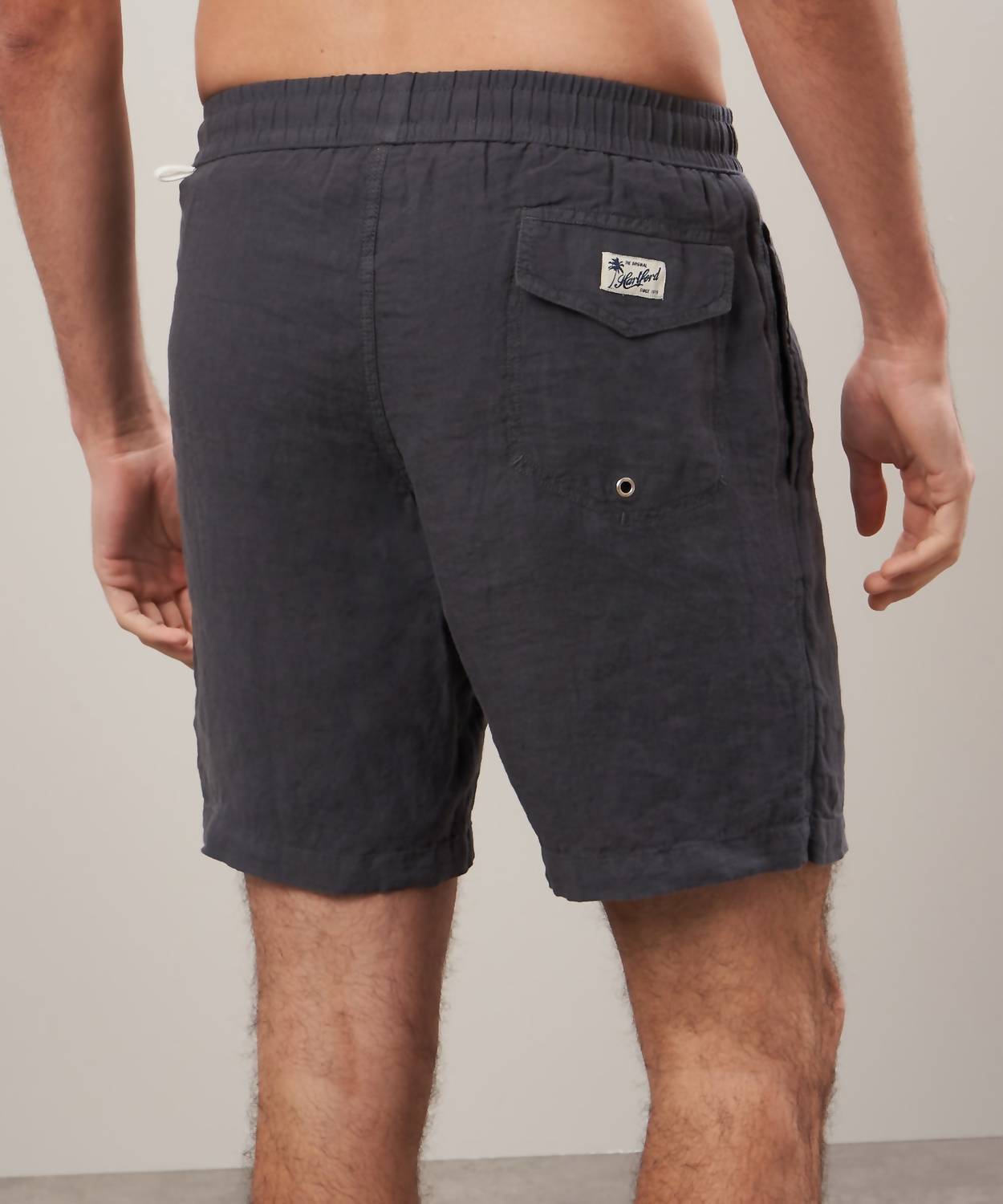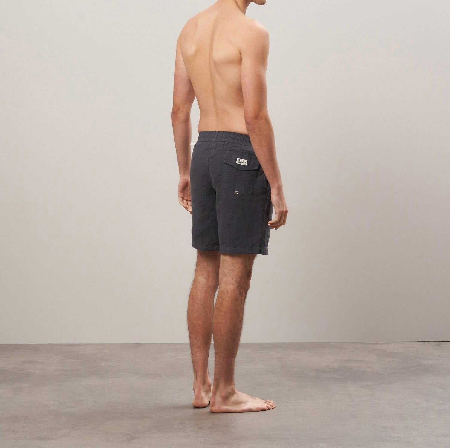 Discover the Hartford Linen Swim Short, a charcoal-hued board short that's perfect for both swimming and casual wear. Featuring a long-length design, these shorts are constructed from 100% linen, lightweight and breathable, with fabric harvested in France and woven in Europe. Made in Morocco, they boast an elastic waistband with contrasting drawstrings, side pockets, and a back pocket. For care, simply hand wash and line dry. Model is 1.89 meters tall and wears a size M.