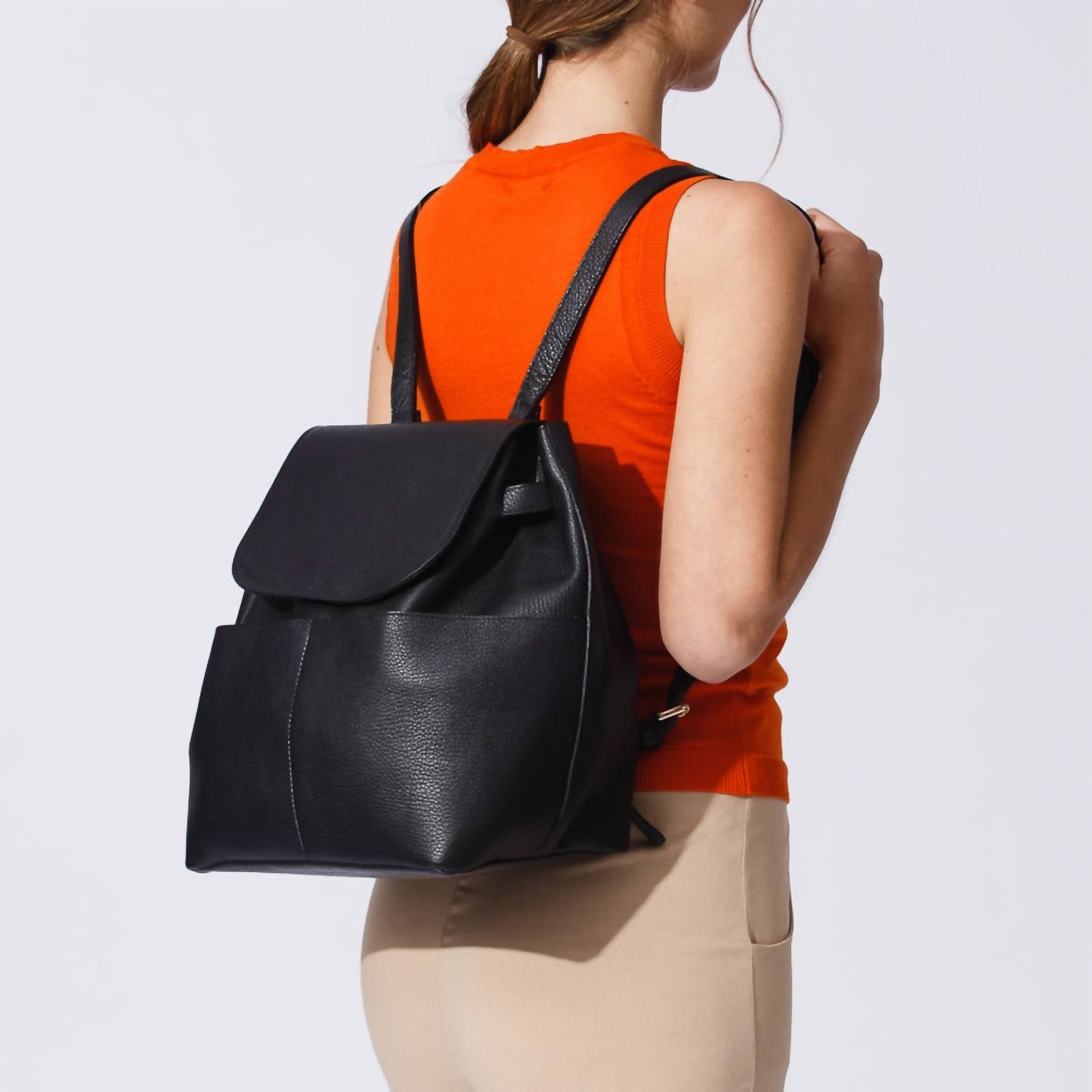 The perfect size backpack that fits everything you need! Discover the Serena Backpack by MESCH, an exquisite blend of style and functionality crafted from 100% genuine high-quality pebbled Argentine leather. In a sleek black finish, this lightweight and spacious backpack boasts two front pockets and an interior featuring one zippered and one open pocket. Designed with adjustable straps for a perfect fit, its unlined interior highlights the soft, high-quality leather. Dimensions are 10.6" in width, 5.1" in depth, and 6.7" in height, making it the ideal everyday companion.