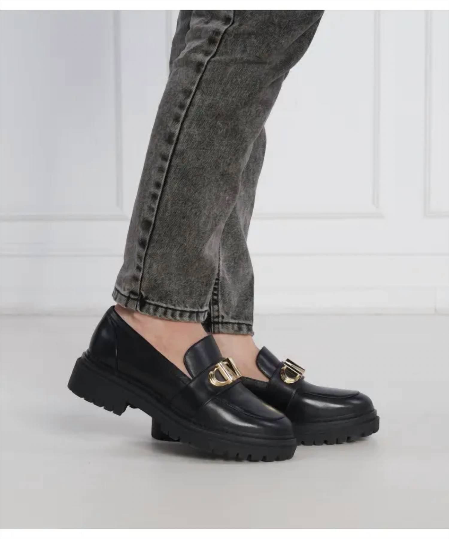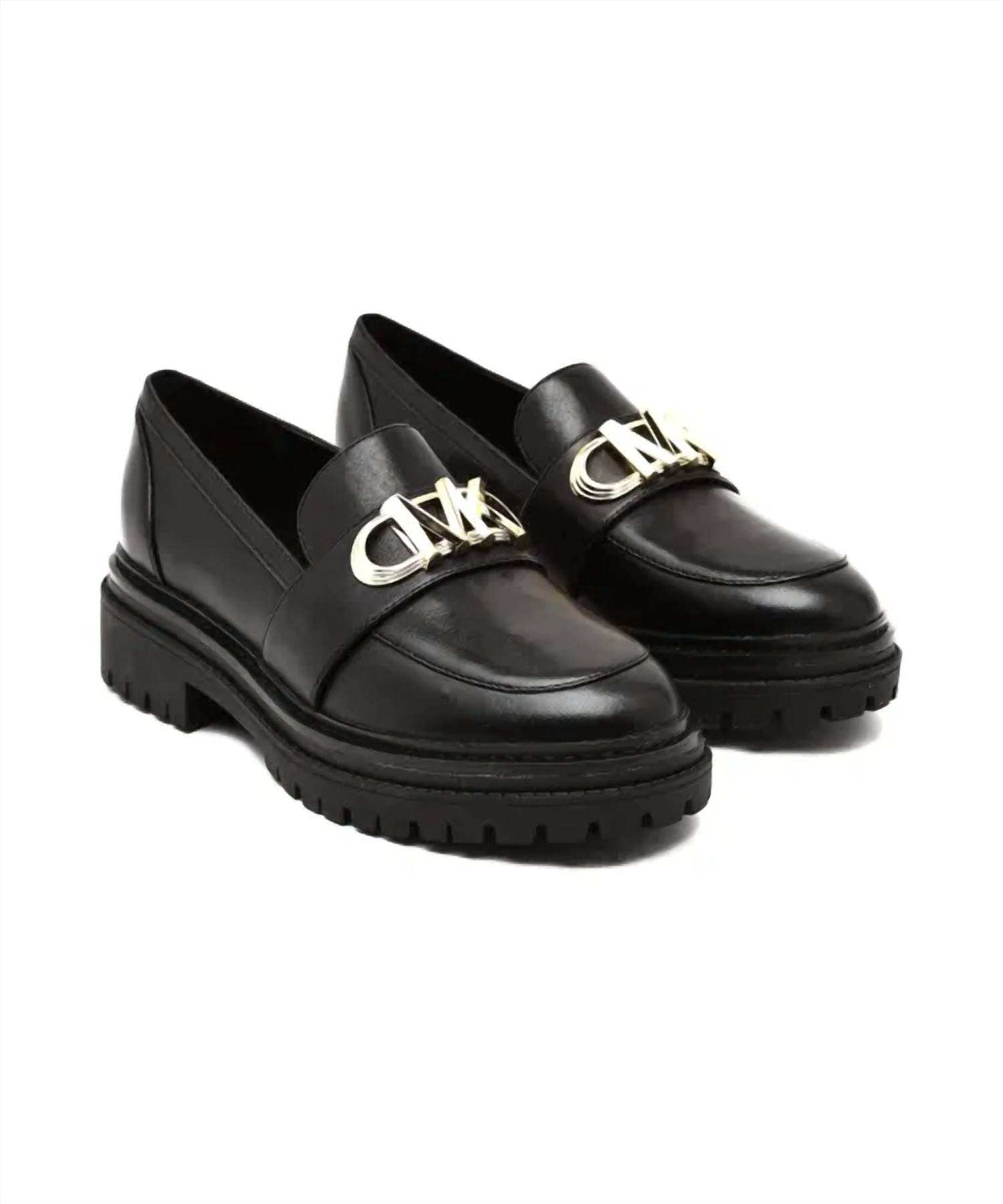 A classic loafer that is both comfortable and polished. Discover the Women's Parker Lug Leather Loafers by MICHAEL KORS, a perfect blend of polished design and street style. Crafted from genuine leather, these loafers feature a sleek black color with signature gold MK hardware across the vamp. They boast a slip-on style and a 1.25" block heel with a chunky lug sole, offering a subtle lift and a modern touch. Ideal for pairing with both trousers and jeans, these loafers promise comfort and style for any occasion.