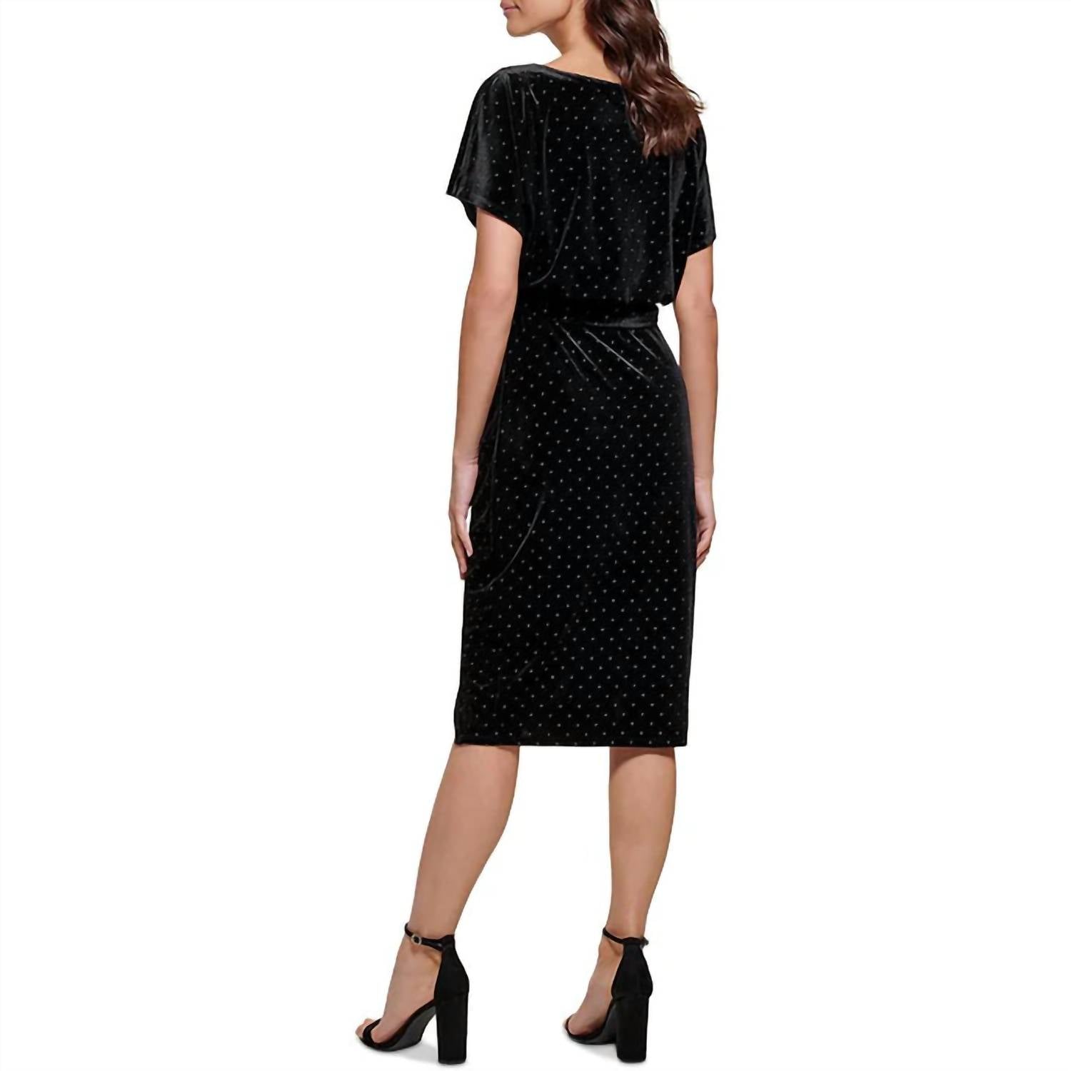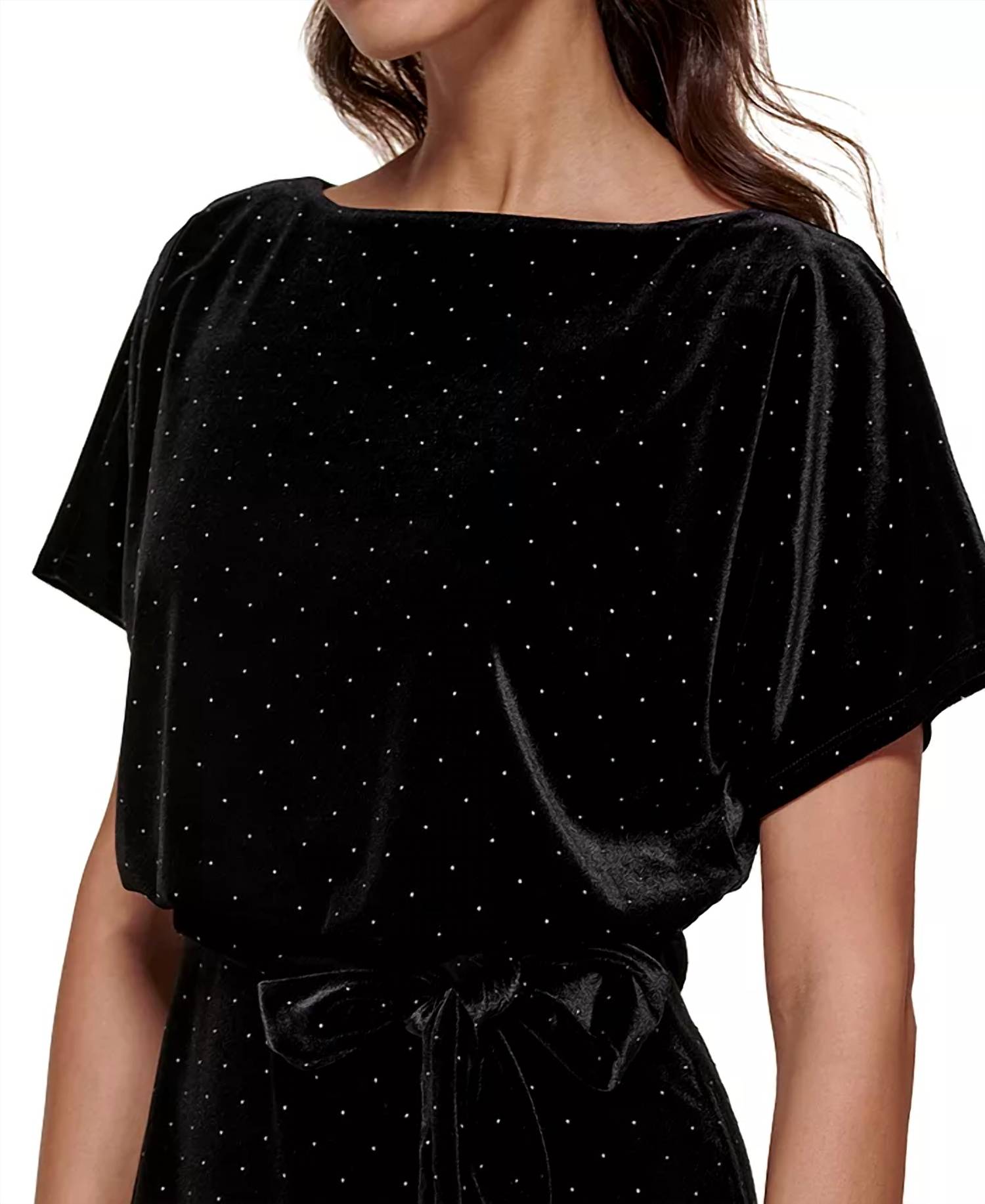 Just add slides or mules and you are good to go. Introducing the Studded Velvet Sheath Belted Dress by Kensie, designed for sophisticated style and comfort. This dress features short flutter sleeves and a knee-length sheath silhouette, perfect for a polished look. Crafted from 92% polyester and 8% spandex, the velvet material offers a luxurious feel. Closure: Pull-on style with a removable belt. Care: Hand wash and line dry.