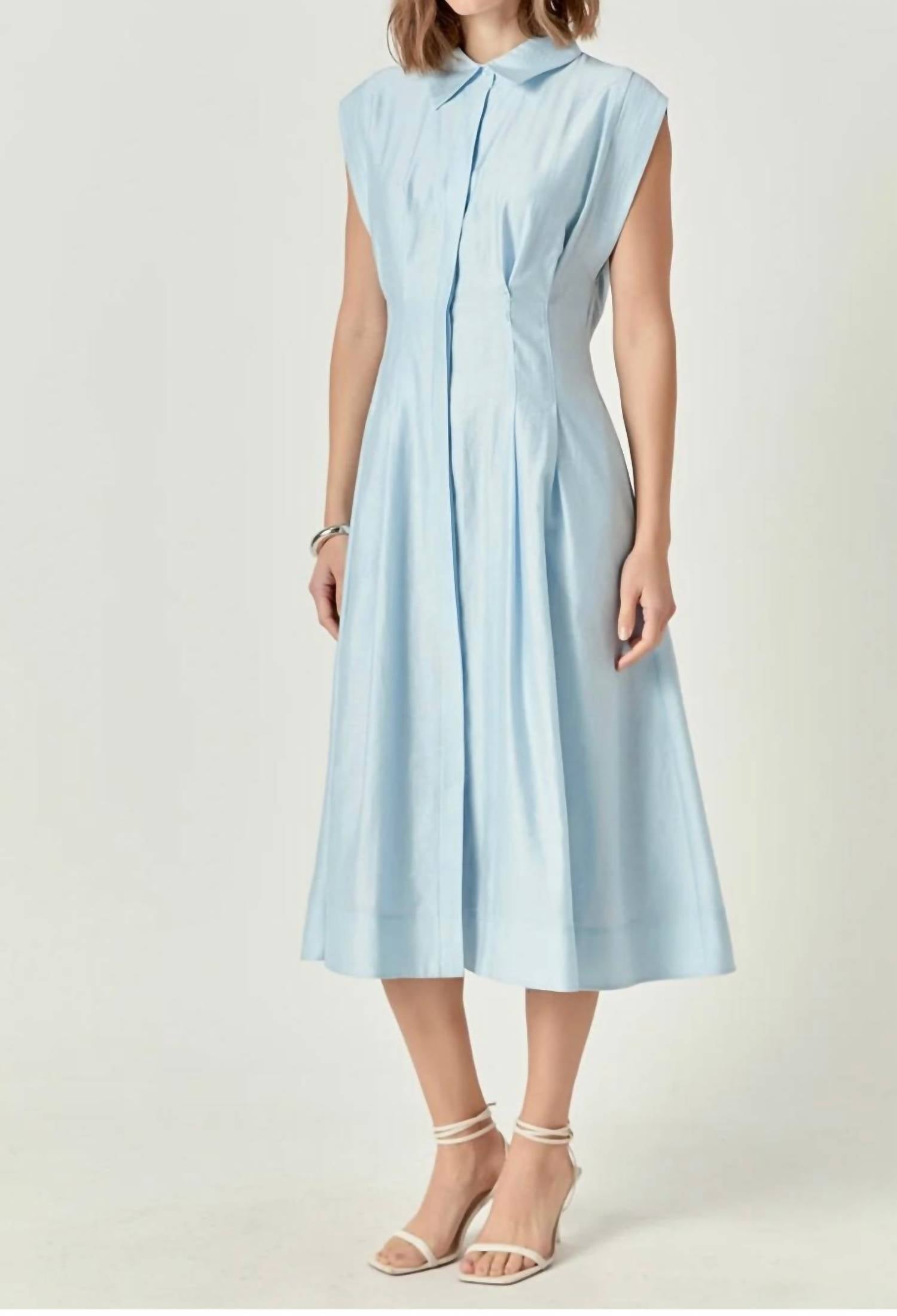A midi dress so versatile, your options for wearing it are endless. Introducing the Contrast Stitch Midi Dress by English Factory, a sophisticated piece in elegant powder blue perfect for a minimalist style. With cap sleeves and a classic collared neckline, this A-line silhouette dress is crafted from a blend of 86% Tencel and 14% Polyester, featuring a 100% Rayon lining for added comfort. The midi-length design ensures versatility, while the front button with a hidden placket closure adds a polished touch.