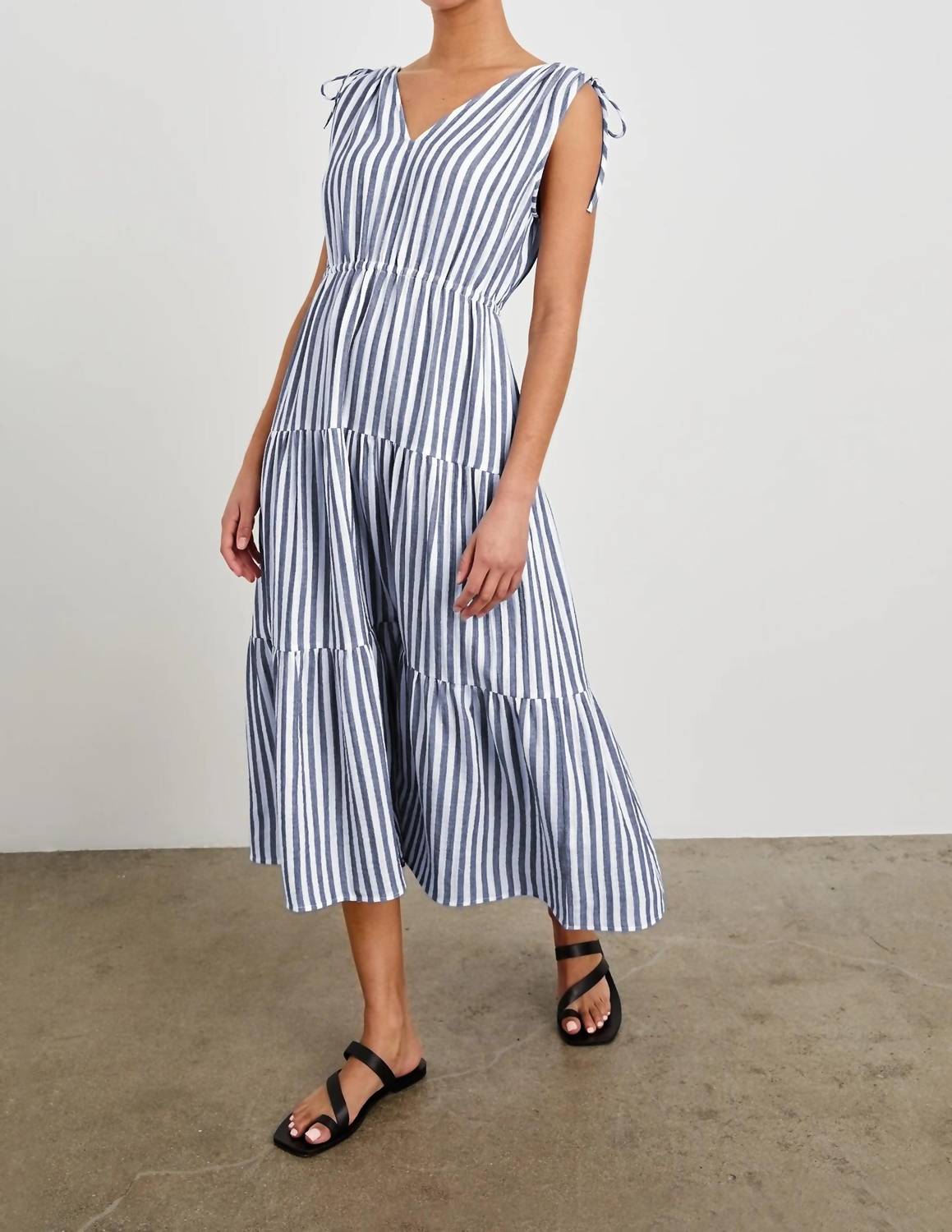 A midi dress so versatile, your options for wearing it are endless. Elevate your summer wardrobe with the Rails Suzette Midi Dress in Admiral Stripe, perfect for a minimalist aesthetic. This sleeveless dress, made from 100% organic cotton, boasts a chic V-neckline and features a comfortable elasticated waist with customizable straps. Designed with a 48" front body length for a size small, this A-line silhouette dress offers pull-on convenience. For care, turn the garment inside out and machine wash cold separately on a gentle cycle, tumble dry low, and cool iron if needed.