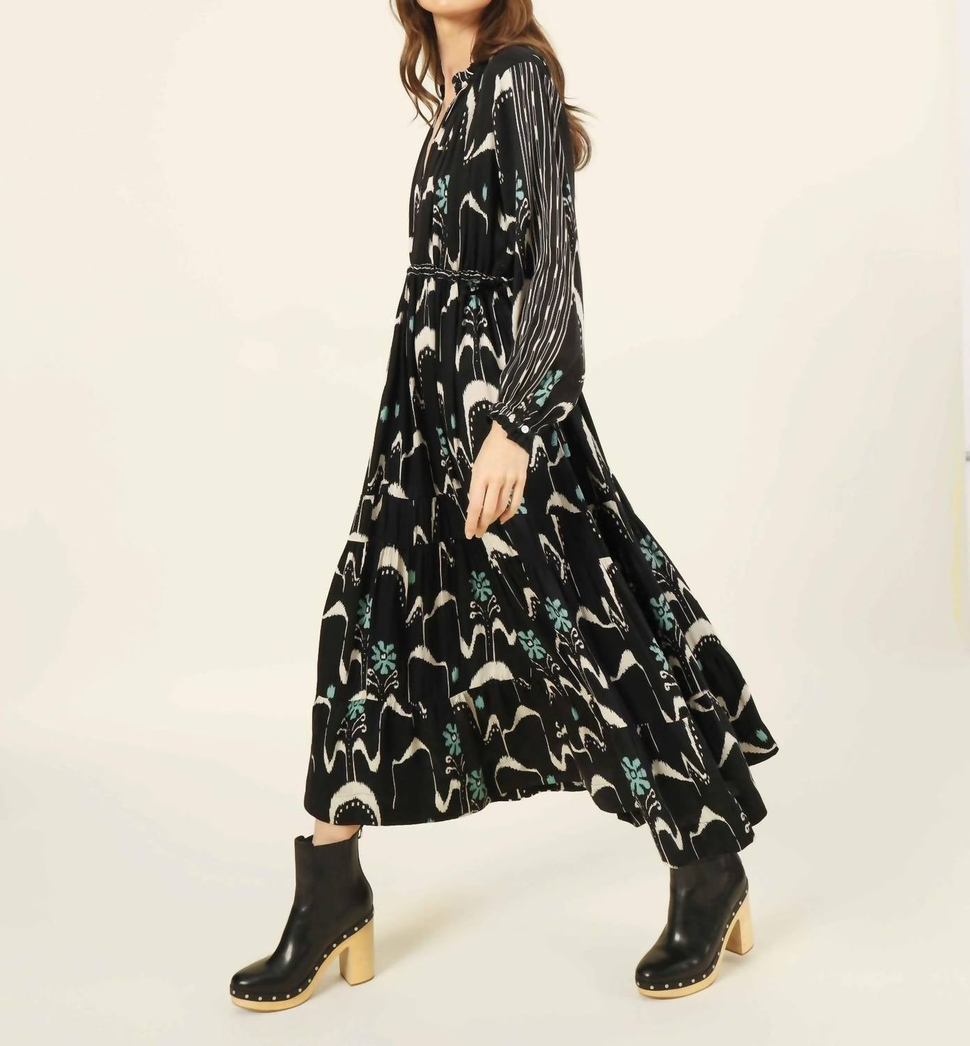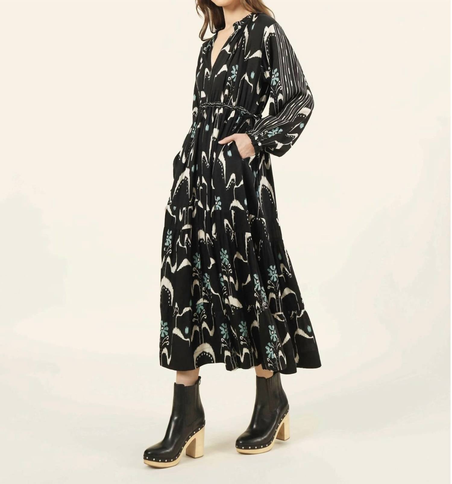 Just add slides or mules and you are good to go. Experience timeless elegance with the Misha Midi Dress by OMIKA, a masterpiece in the Samira Smokestack hue. Crafted from 100% Modal, this patterned A-line dress features long sleeves and a chic ruffle V-neckline. The elastic waist and hook-and-eye closure offer both comfort and a flattering fit. Care is simple with machine wash and line dry instructions.