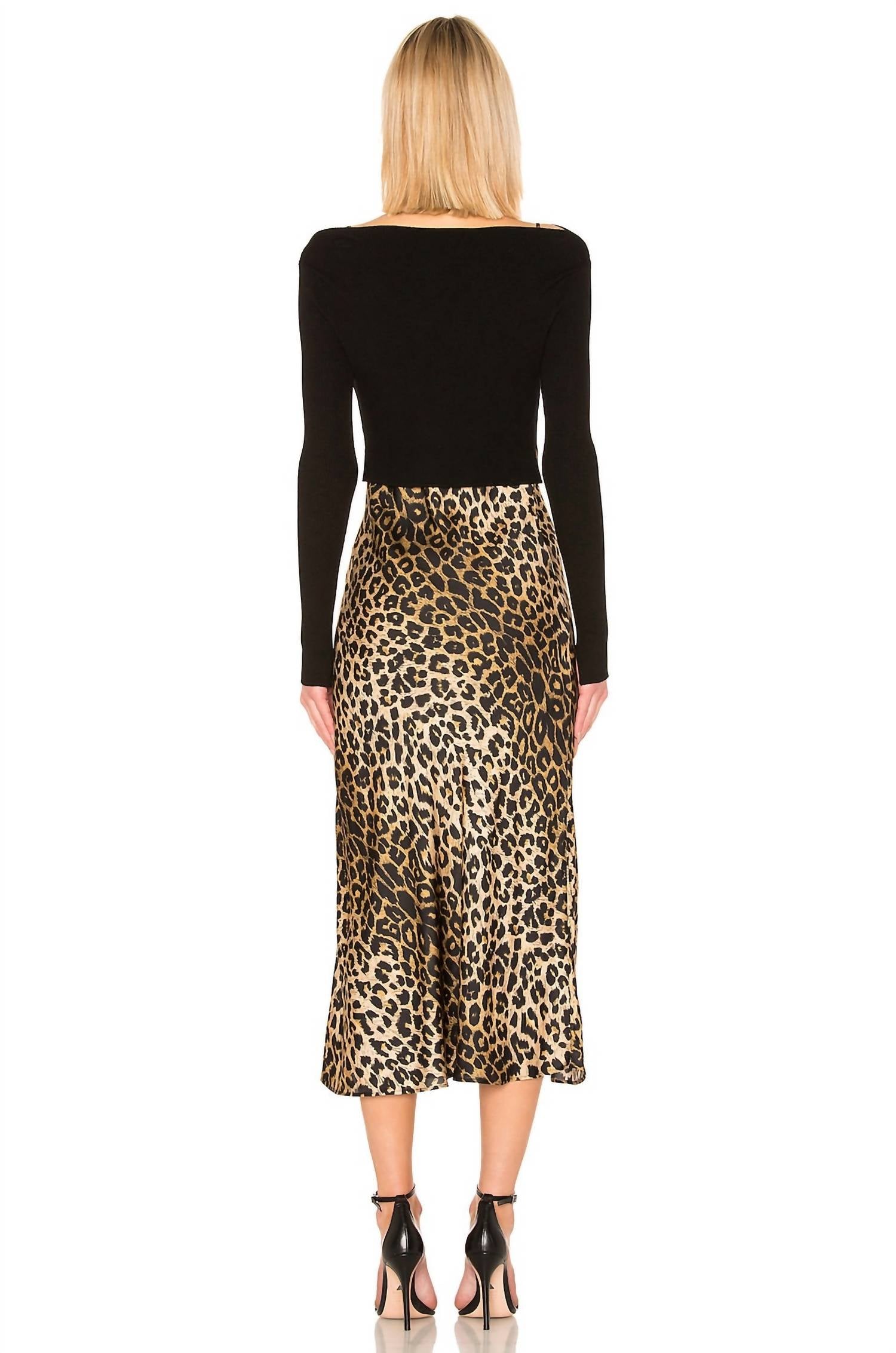 A midi dress so versatile, your options for wearing it are endless. The Hera Leppo Shirt Dress by AllSaints is a chic addition to your fall wardrobe, featuring a sleek bodycon silhouette in a sophisticated animal pattern. Crafted as a viscose blend with 71% viscose and 29% poly knit, this dress comes with a detachable rib knit pullover and adjustable shoulder straps for versatile wear. With a length of 52 inches, it offers a vintage-inspired look that is perfect for a dinner party. Originating from China, this black pull-on shirt dress is designed for women and should be dry cleaned only.