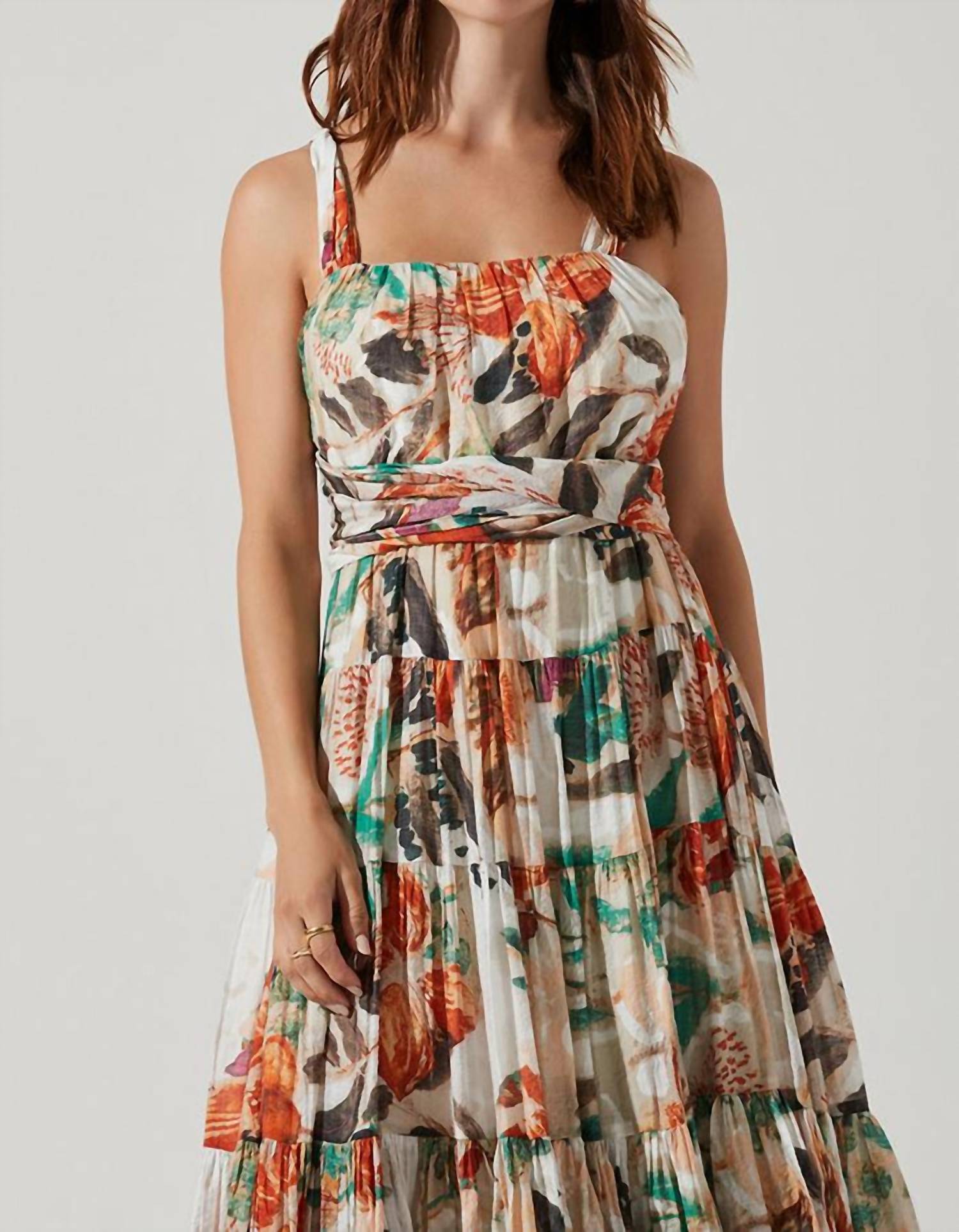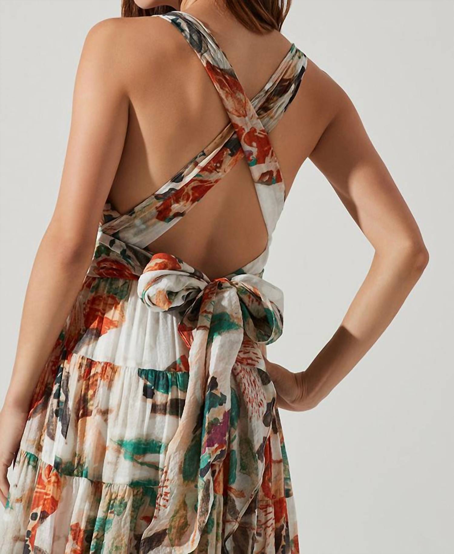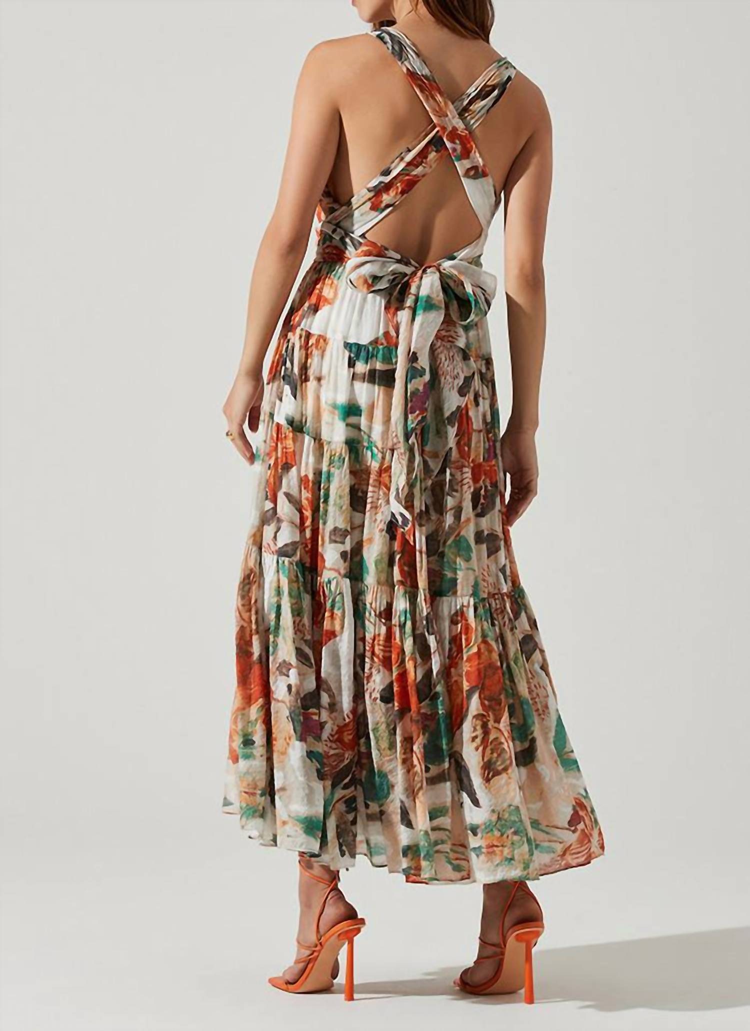 The perfect length dress does exist. Step into the spotlight with the Almina Maxi Dress by ASTR, a stunning choice for your spring dinner parties. This sleeveless dress flaunts a maxi length and features an open lace-up criss-cross back, effortlessly blending elegance with a boho chic vibe. Crafted from a durable viscose blend (70% Viscose, 30% Nylon), it's fully lined with 100% Rayon for added comfort in a taupe orange floral print that captures the essence of the season. Closure: Tie closure. Care Instructions: Dry clean only. The model is wearing a size XS (5’4” height, 32C bust, 24” waist, 31” hips).
