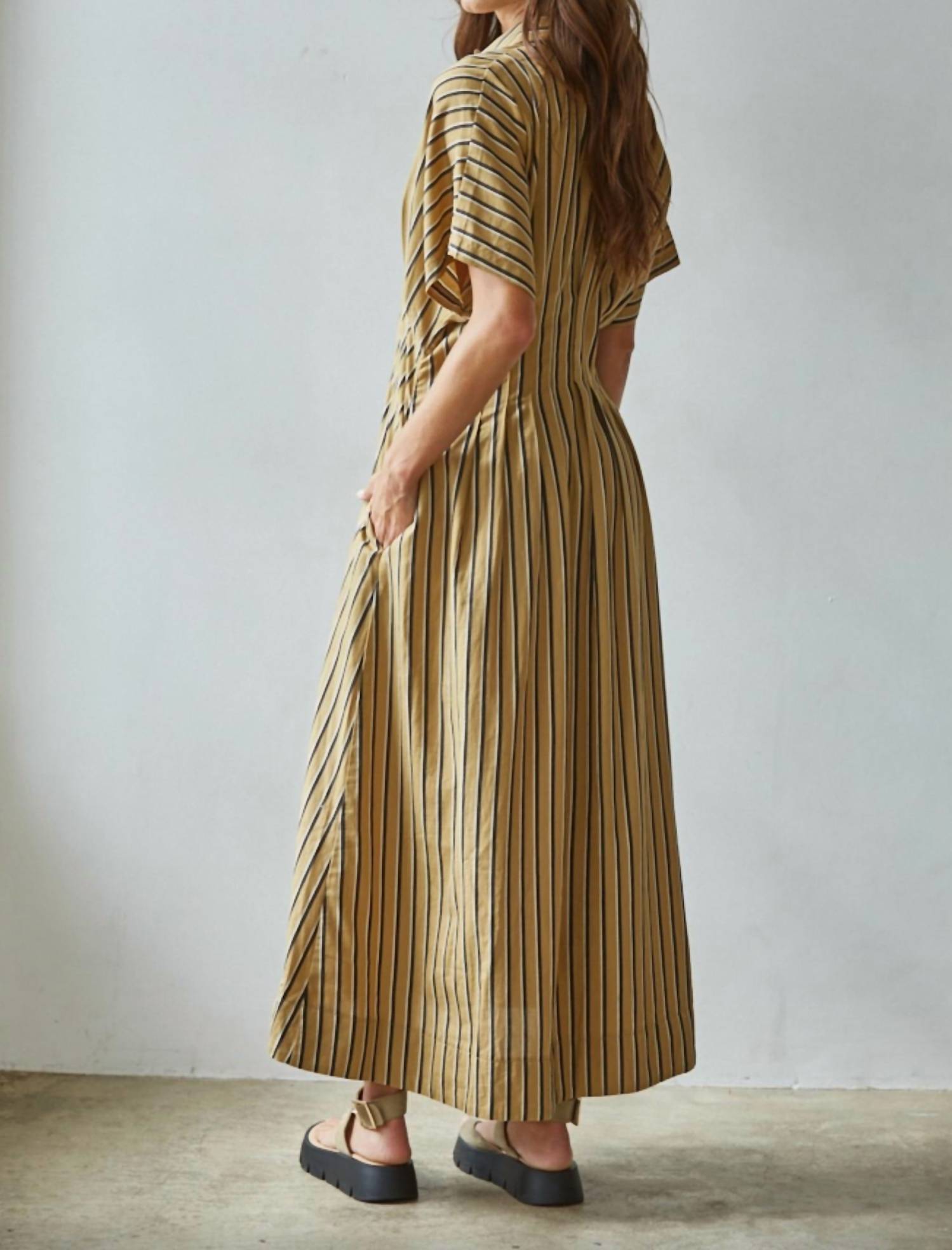 The perfect length dress does exist. Elevate your seasonal wardrobe with the Striped Woven Midi Dress by By Together, a preppy coffee-colored creation designed for stylish versatility. Featuring short sleeves and a flattering shirt silhouette, this dress exudes elegance with its stripe pattern and collar neckline. Made from 100% cotton, it's secured with a button closure for a polished finish. Care instructions include hand washing cold, ensuring this piece remains a wardrobe staple across spring to holiday gatherings. Model is 5'11" wearing size S, perfect for a sophisticated holiday party look or an everyday elevated ensemble.