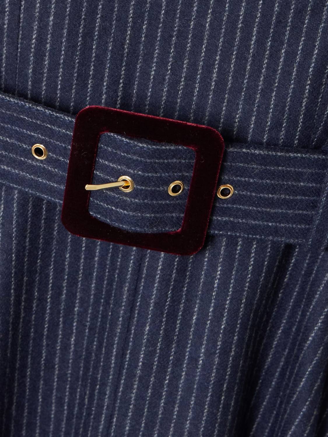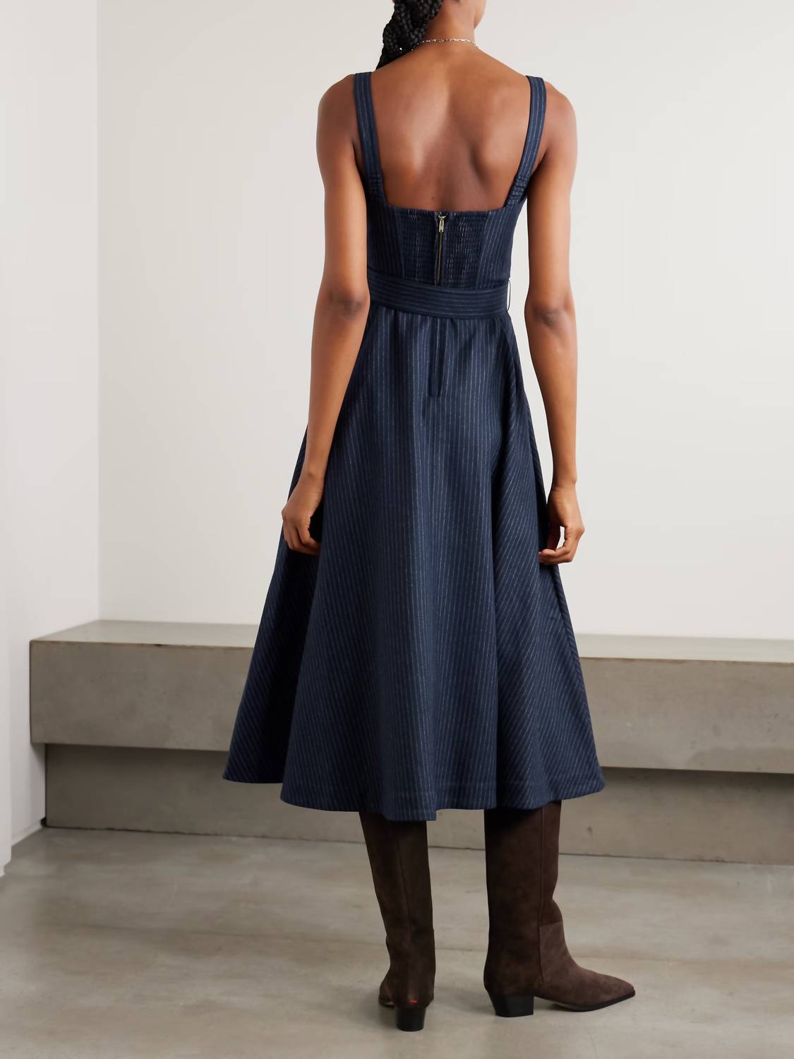 The perfect length dress does exist. Introducing the Calypso Velvet-trimmed Dress by Cara Cara, a sophisticated piece perfect for evening events this fall. This sleeveless midi dress is crafted from a navy wool-blend with a chic pinstripe pattern sourced from Italy. Its design features underwired cups and a velvet-trimmed belt, complemented by a shirred back panel for an impeccable fit. The dress offers a zip closure at the back, is fully lined for comfort, and requires dry cleaning.