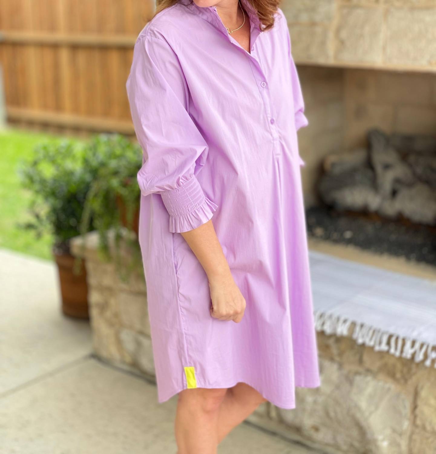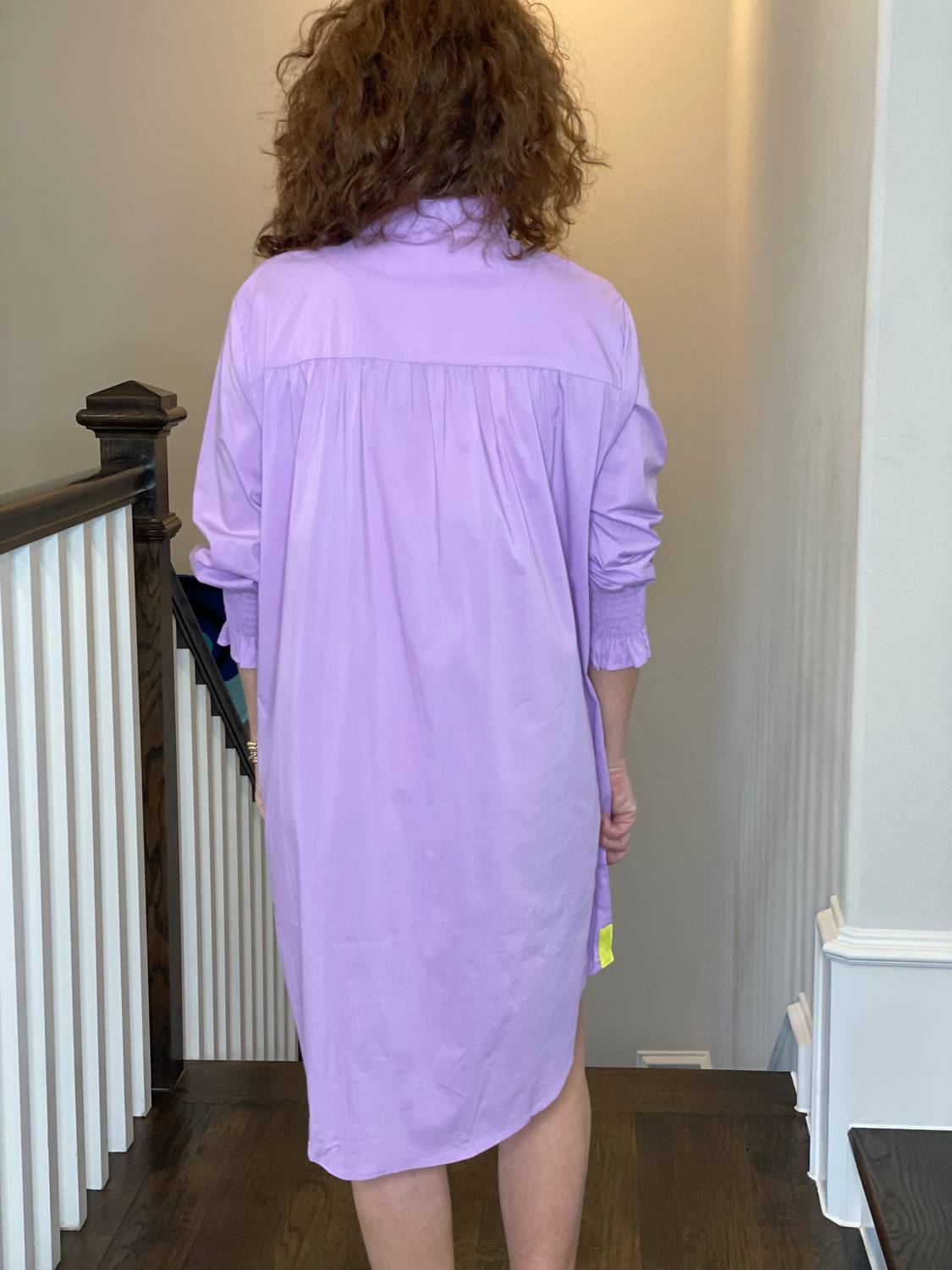 Just add slides or mules and you are good to go. Introducing the Caryn Lawn Kimberly Dress in stunning lilac, a chic casual piece perfect for spring fashion. This A-line midi dress features three-quarter sleeves and a solid pattern that effortlessly pairs with sneakers or sandals. Crafted from a blend of 65% cotton, 32% nylon, and 3% spandex, it offers comfort and stretch with a button closure for ease of wear. Care includes machine wash and line dry. Available in one size fits most (fits sizes 4-12).