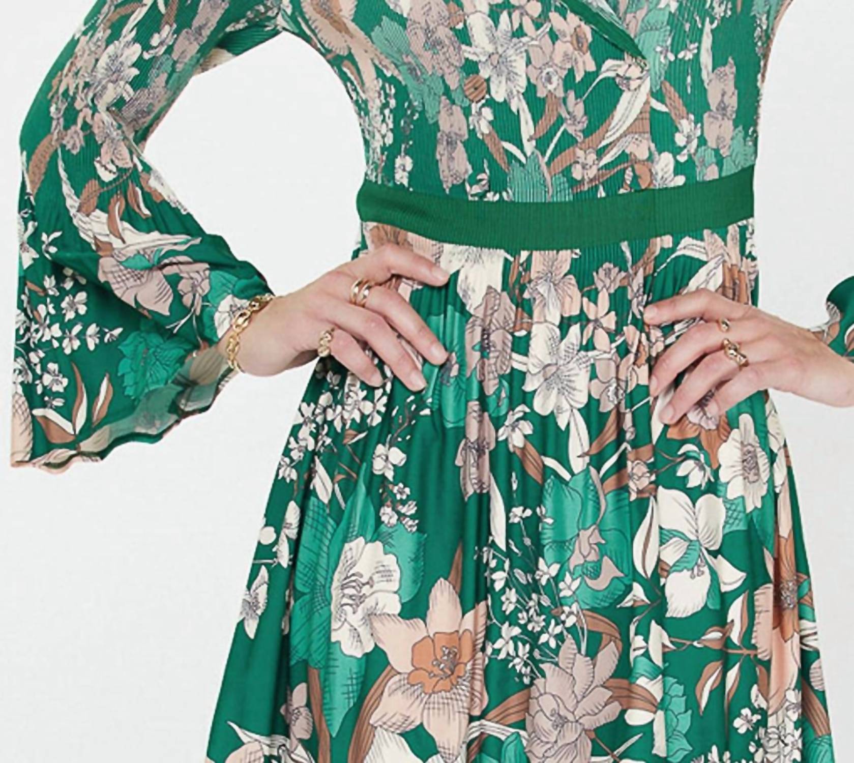 Just add slides or mules and you are good to go. Discover the elegance of the Floral Pleated Midi Dress by Current Air, featuring long sleeves and a flowing pleated design in a vibrant green floral pattern. This dress is crafted from 100% polyester, offering a perfect blend of casual comfort and cocktail sophistication with an A-line silhouette. Designed for day-to-night versatility, it boasts a V-neckline that enhances its feminine appeal. Care: Machine wash.