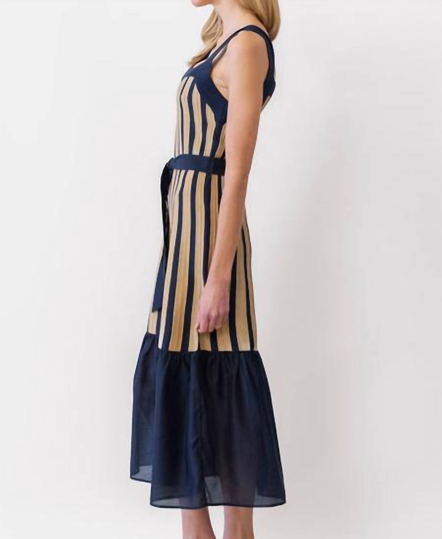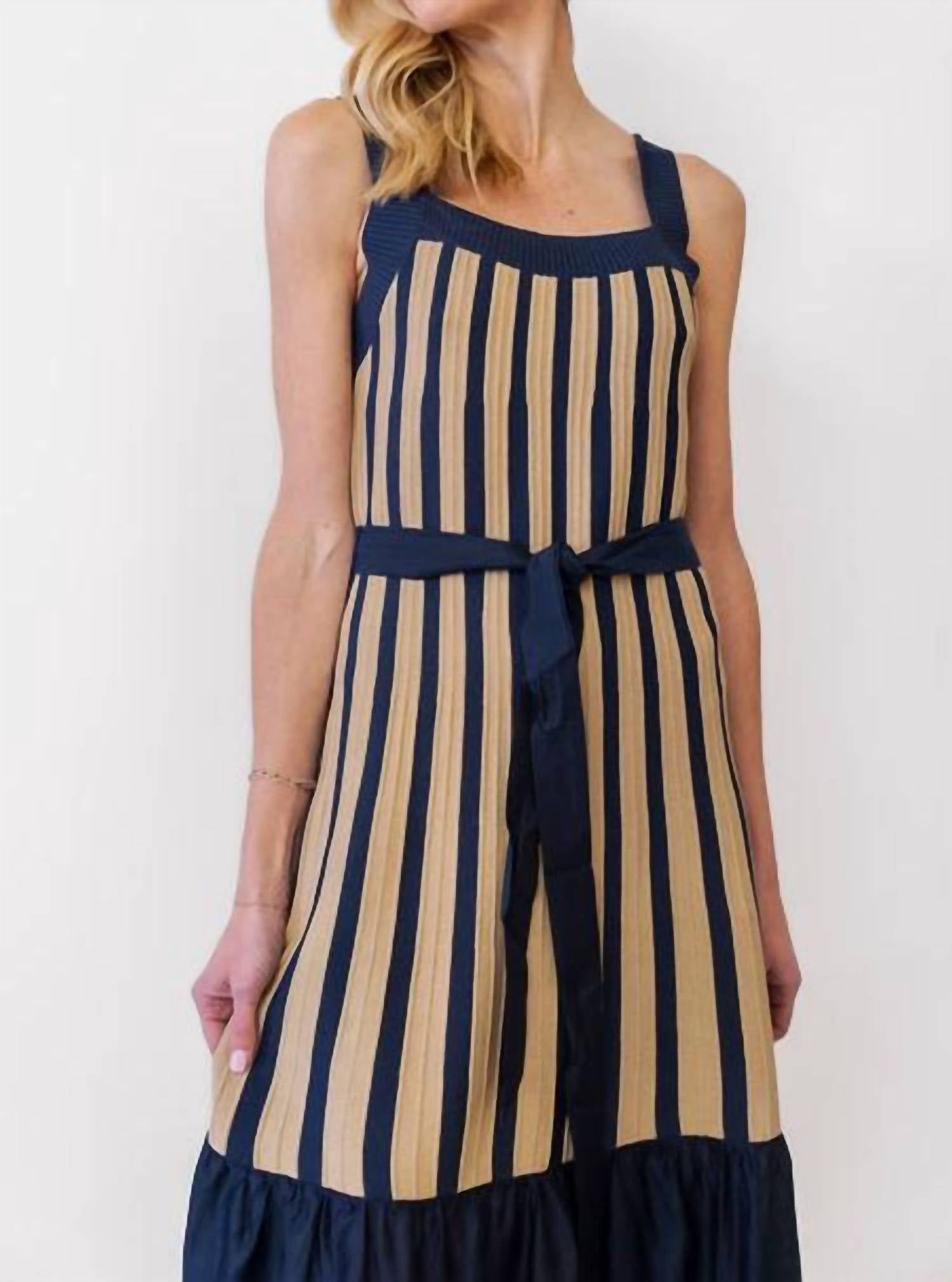 Just add slides or mules and you are good to go. Introducing the Zuri Contrast Striped Knit Midi Dress by Current Air, a show-stopping piece perfect for evening events. This navy dress features a sleeveless design and is skillfully crafted from a viscose blend for a curve-hugging fit. The pull-on closure ensures ease of wear, while the dress's woven asymmetrical skirt adds an eye-catching flair. Made with a composition of 55% viscose and 45% polyester, it requires hand washing to maintain its sleek look. Model is 5’7” and wears a size small.