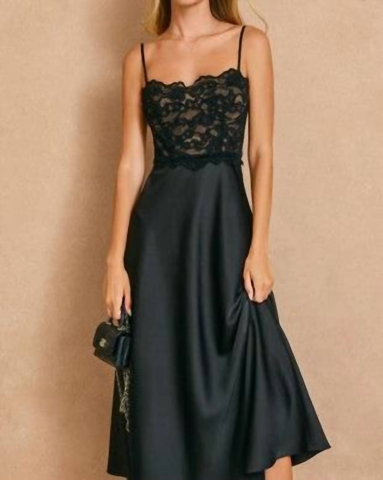 Just add slides or mules and you are good to go. Introducing the Marigold Dress by DRESS FORUM, a sophisticated choice for any evening event. This black midi dress features a sleeveless design with a sweetheart neckline and an elegant A-line silhouette. The piece combines a lace bodice and satin skirt, with a removable adjustable shoulder strap for versatile styling. Composition includes a blend of Nylon and Cotton (Shell 2: 60% Cotton, 40% Nylon), while offering an exposed back zipper for a refined look. Made for dry cleaning only, this dress embodies quiet luxury with no pockets for a streamlined finish. Model is 5'9" and wearing size Small.