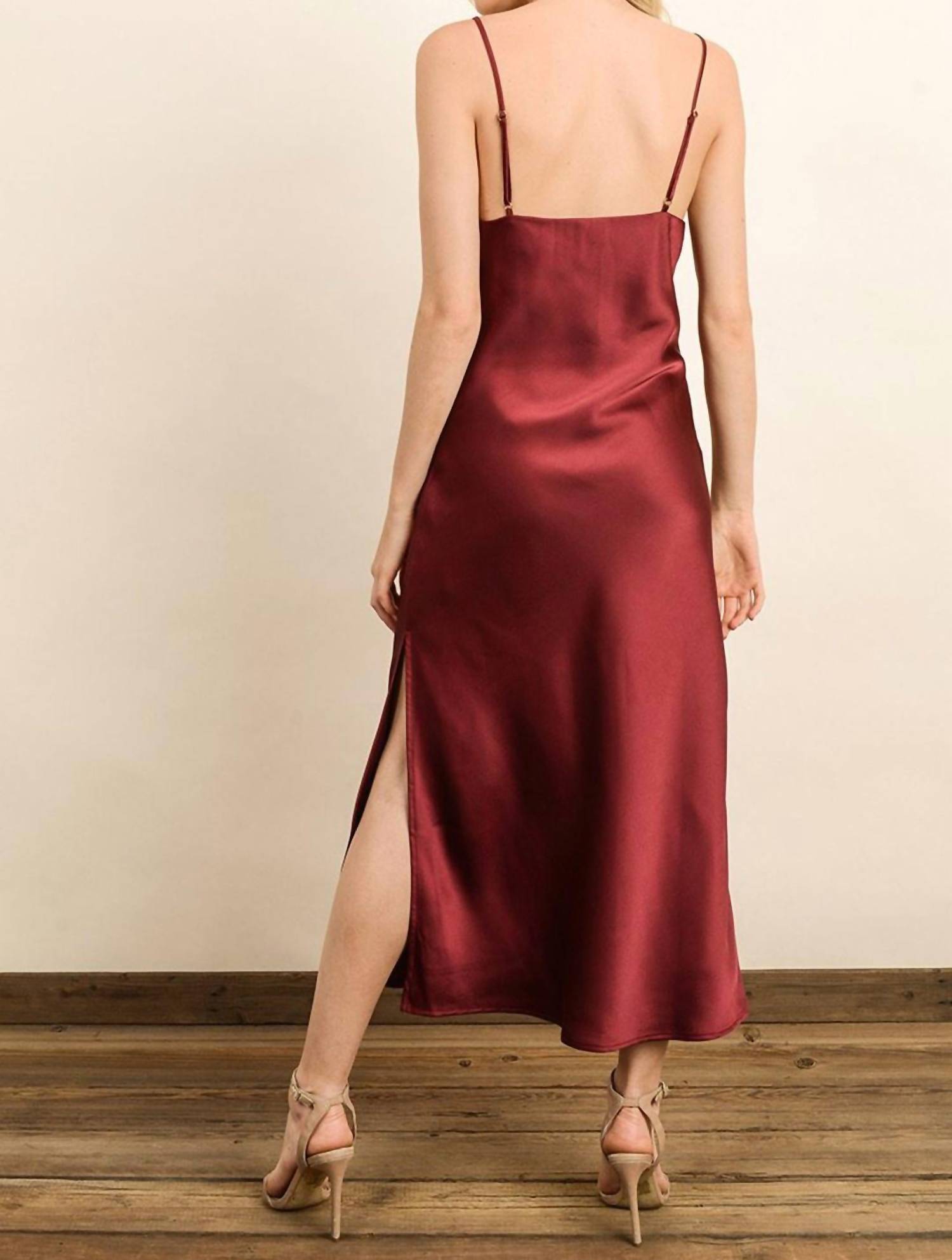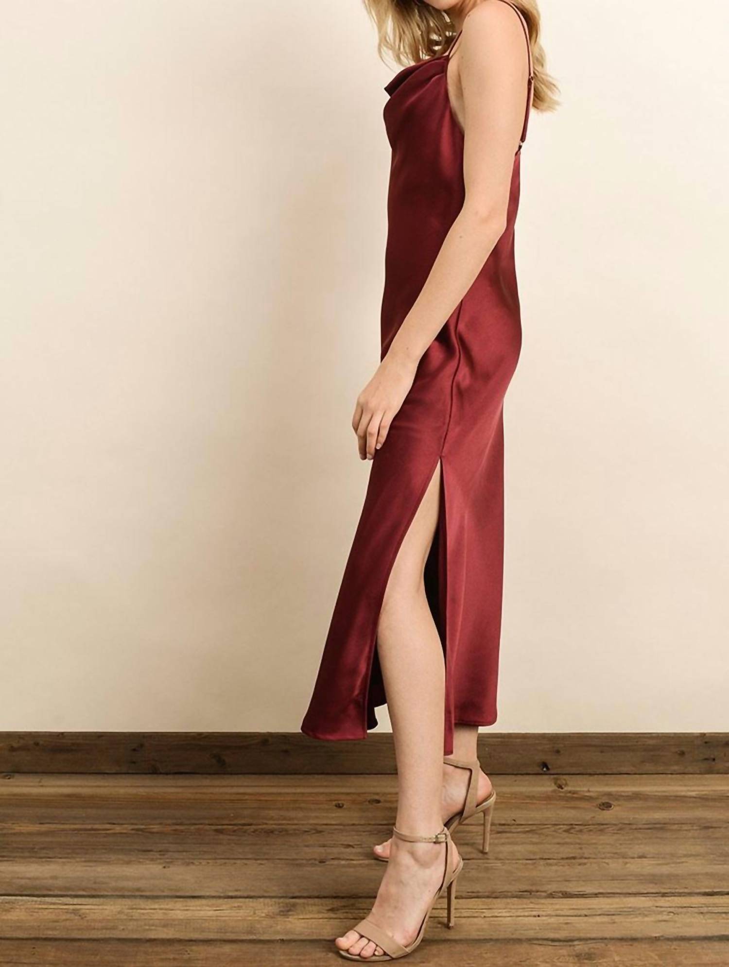 A midi dress so versatile, your options for wearing it are endless. Discover the elegant 90's Inspired Satin Cowl Neck Midi Dress by DRESS FORUM, a sophisticated option for any special occasion. This solid black satin dress features delicate spaghetti straps and an alluring cowl neck, complemented by a low back and side slit for added glamour. With a composition of 97% Polyester and 3% Spandex, it offers a silky finish that drapes beautifully. While closure and care instructions are not specified, this timeless piece is a stunning addition to your evening collection.