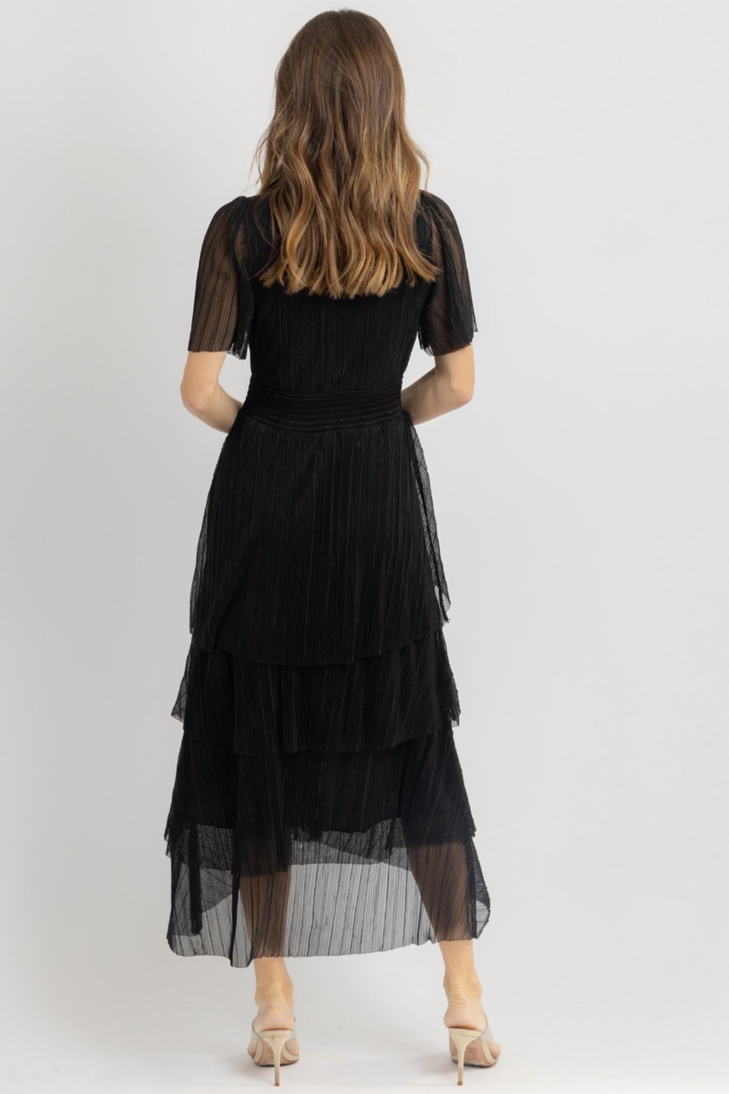 The perfect length dress does exist. Unveil an air of elegance with the Midnight Metallic Midi Dress by DRESS FORUM, perfect for your next dinner party or New Year's Eve celebration. This A-line silhouette features flutter sleeves and a surplice V-neckline, adorned with tiered ruffles and a golden metallic shimmer that captures the essence of quiet luxury. Crafted from 100% Polyester, it is fully lined for a smooth fit. Note: Naomie is wearing a size small, standing at 5'8" with a dress size of 2.
