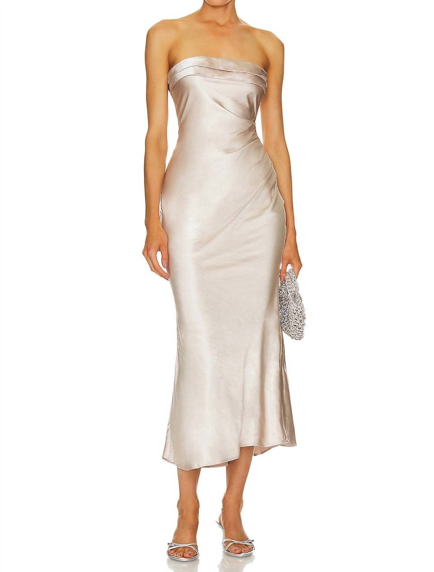 A midi dress so versatile, your options for wearing it are endless. The Hollywood Midi Dress by ELLIATT is a stunning choice for your next Holiday Party. This strapless mermaid silhouette dress in champagne features a hidden side zipper closure for a sleek fit. Made from 100% polyester, the lightweight satin fabric drapes beautifully. Care instructions: Dry clean only. Ideal for Valentine's Day and summer soirées.