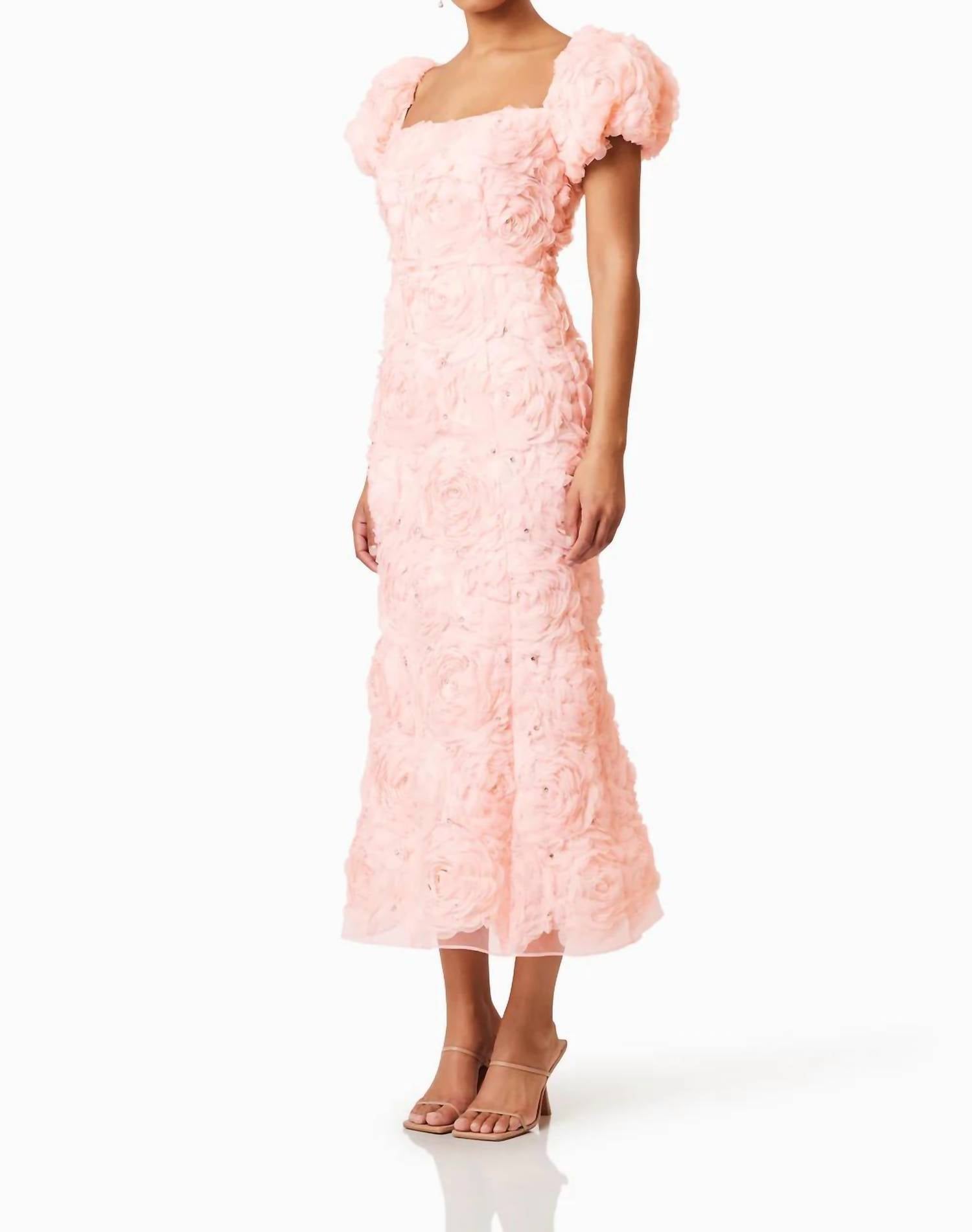 A midi dress so versatile, your options for wearing it are endless. Elevate your romantic wardrobe with the Rosella Midi Dress by ELLIATT, perfect for a prom night or a Valentine's Day outing. Featuring puff short sleeves and made from 100% polyester, this ballet pink dress flaunts a mermaid silhouette and a square neckline for a modern twist. The 3D cluster floral fabrication with embedded diamante detailing adds texture and sparkle, complemented by a kick flare skirt for a flattering flowy fit. Closure: Invisible centre back zipper. Care: Dry clean only.