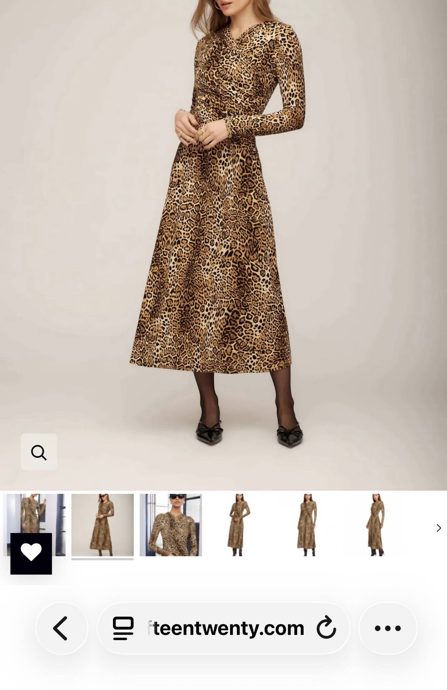 The perfect length dress does exist. Fitted through the bodice with stretch. Flared midi skirt Animal Print Knit:96% Viscose 4% Elastane Made in the USA of Imported Fabric Machine wash cold, hang to dry or dry clean. Length: 49 1/2 inches (Size S) Long Sleeve Crossover V-Neck Back slit