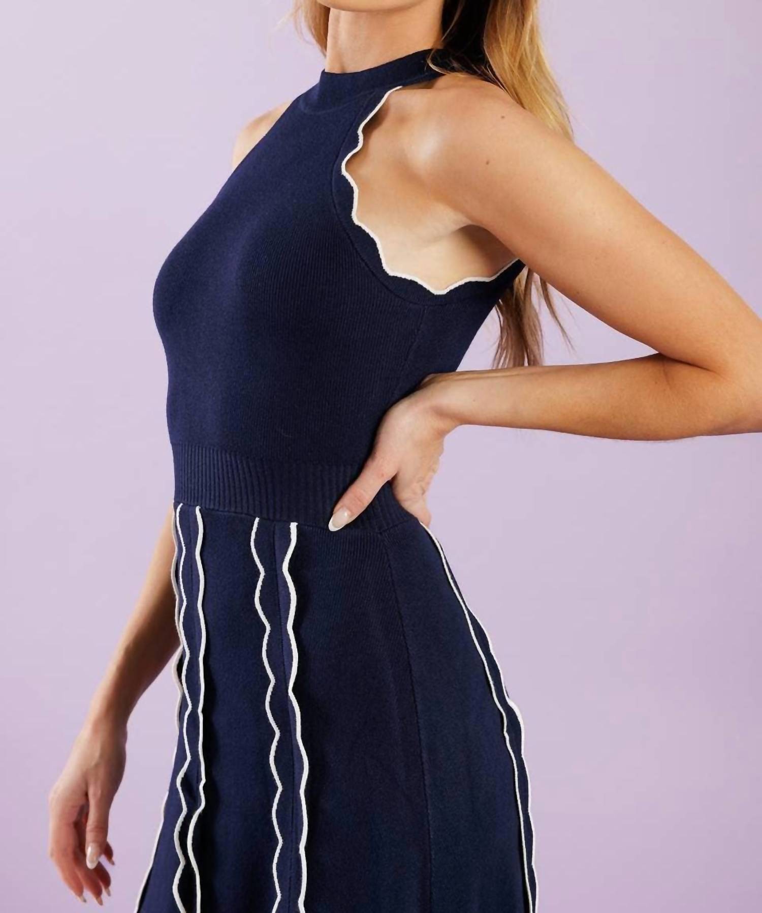 Just add slides or mules and you are good to go. Elevate your evening look with the Nautical Whisper Midi Dress by FLYING TOMATO, a charming blend of elegance and comfort. This women's midi dress features a chic halter neckline and a stylish back button closure, making it perfect for summer occasions. The dress is crafted from a soft 75% Viscose and 25% Nylon knit, offering a comfortable stretch in a navy blue and ivory palette with a delicate wave pattern. At an approximate length of 55", it's designed to flatter with an A-line silhouette. Model is 5'8" and wearing a size small.