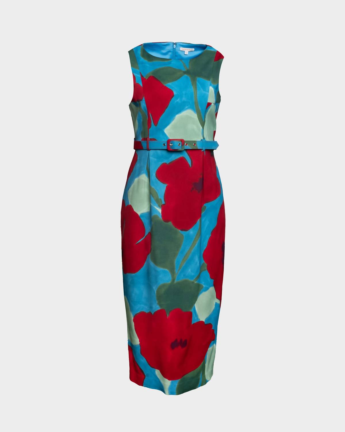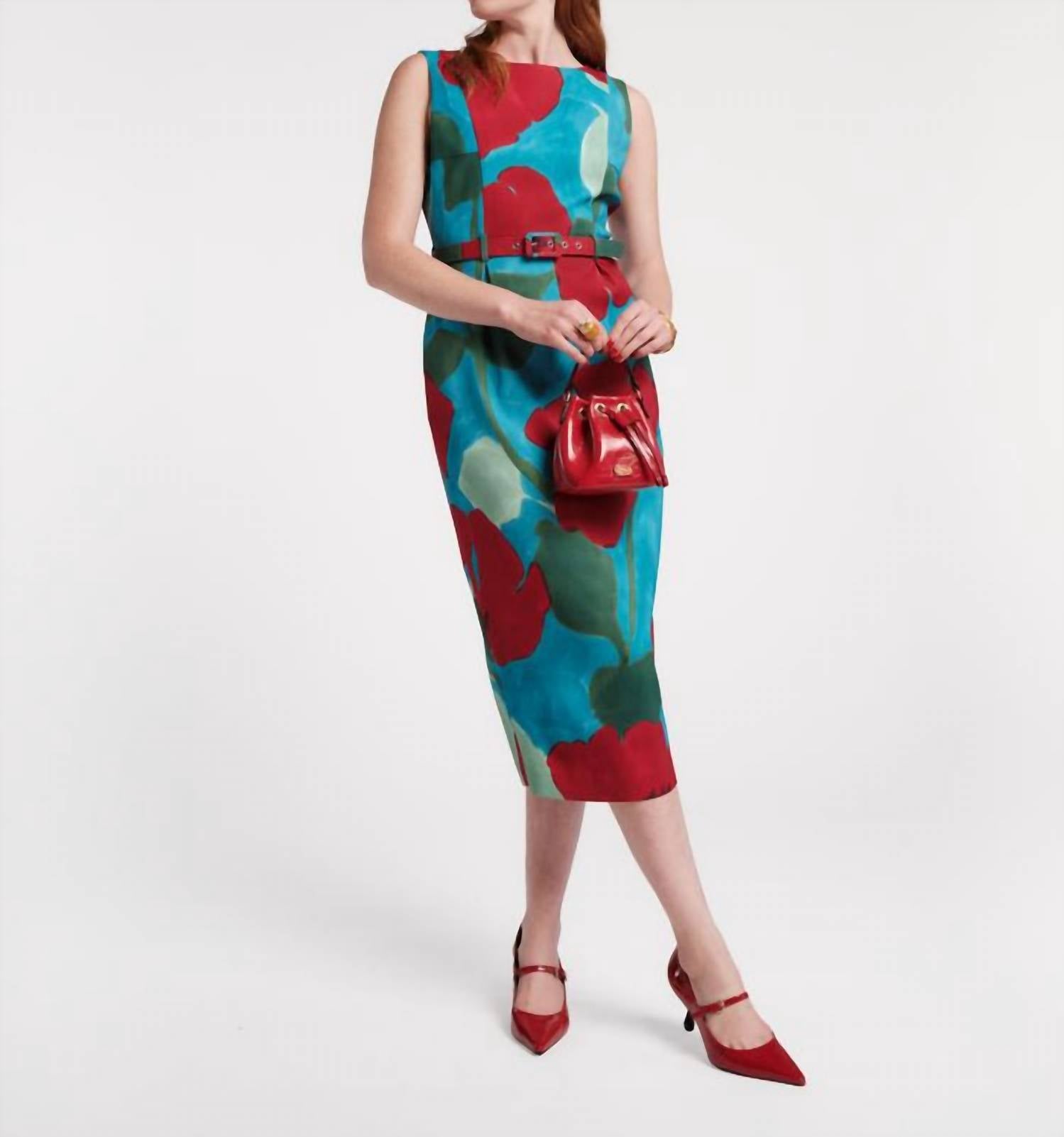 A midi dress so versatile, your options for wearing it are endless. Unveil elegance with the Audrey Belted Midi Dress by Frances Valentine, a perfect choice for a holiday party in the radiant Floating Floral pattern. This sleeveless sheath dress showcases a sleek, tailored silhouette and a flattering bateau neckline, complemented by a belted waist for added definition. Crafted from a 96% Viscose and 4% Spandex blend, it features a center back zipper closure and convenient front pockets. Made in India, this piece requires gentle care: hand wash cold, no bleach, line dry, low iron, and remove the belt before washing.