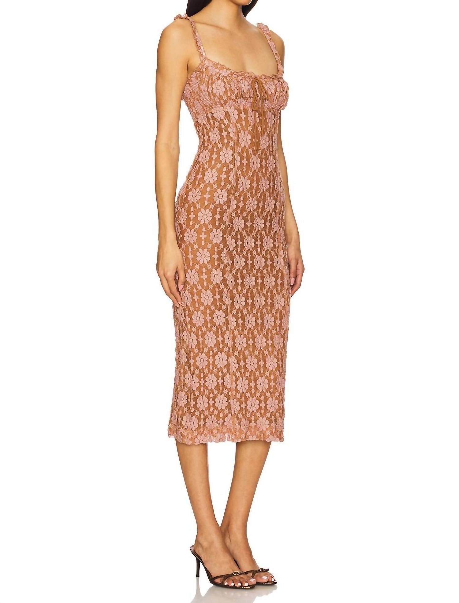 A midi dress so versatile, your options for wearing it are endless. Embrace elegant detail with the Lucinda Lace Midi Dress by Free People, beautifully crafted in a Ginger Combo. This strapless dress showcases intricate floral embroidery and ruffled shoulder straps, adding a touch of romance. It features a bodycon silhouette that falls to a length of 43 inches and is fully lined for comfort. Composition: Lace textile. Machine wash in cold water.