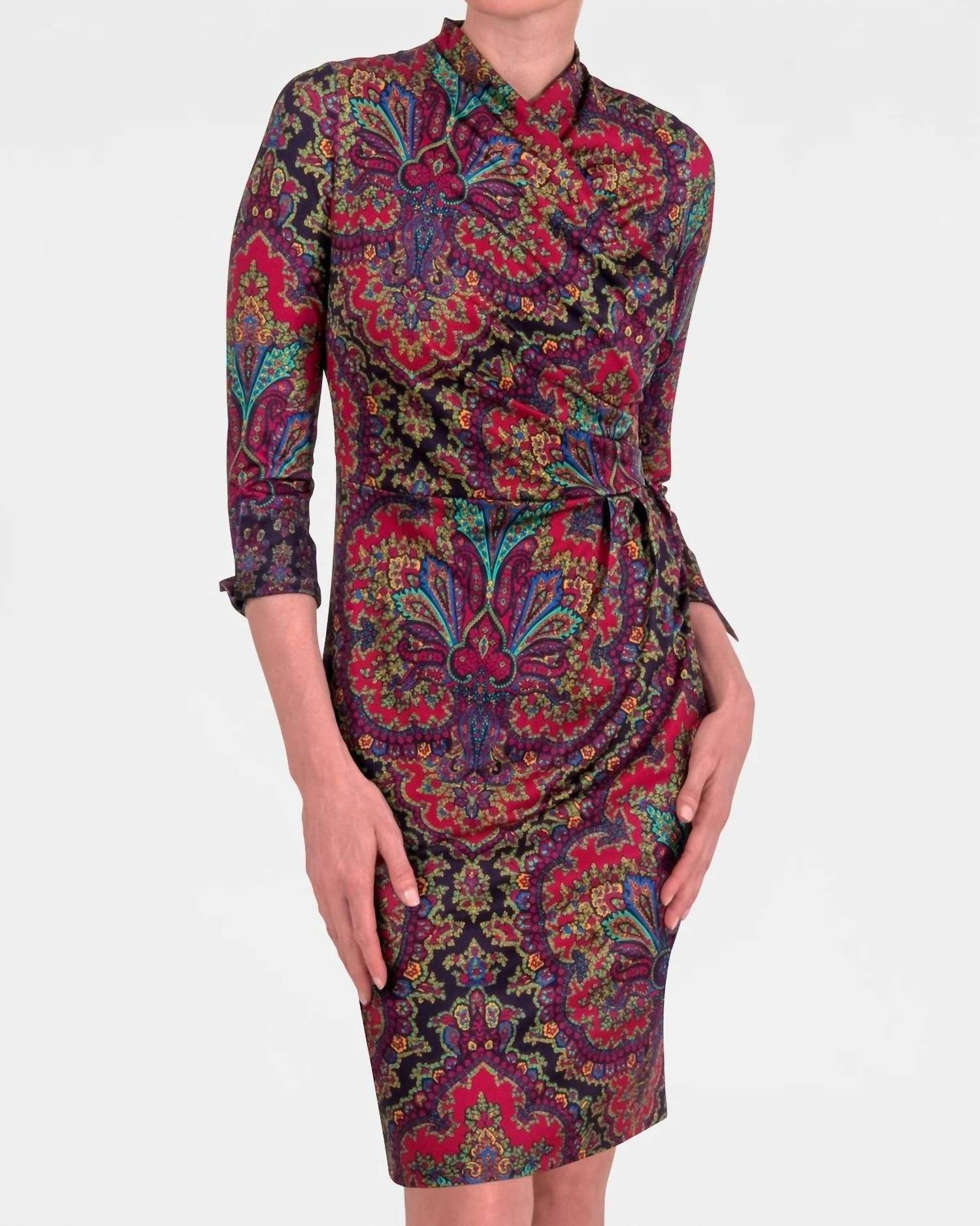 A midi dress so versatile, your options for wearing it are endless. Unveil timeless elegance with the Wrapsody Midi Dress by Gretchen Scott in a captivating Passion Paisley print. This piece showcases a flattering sheath silhouette with a pleated surplice neckline that can be styled as a V neckline or closed neckline, complemented by three-quarter sleeves and a turn-back cuff with a 3" slit. Crafted from a jersey blend of 97% Polyester and 3% Spandex, this 36" length garment ensures a chic, vintage-inspired look for evening events. Closure: Button closure. Care: Machine wash cold, cool tumble dry or dry clean.