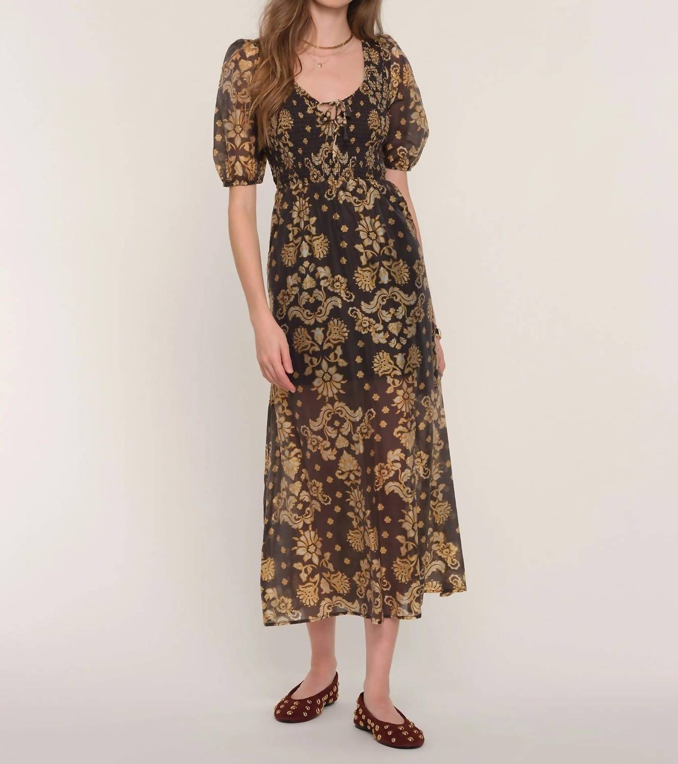 Just add slides or mules and you are good to go. Step into boho chic style with the Peregrine Dress by Heartloom, a delightful midi in tapestry print. This women's dress features a smocked bodice with a front tie closure and slightly puffed short sleeves for a feminine touch. Made from luxurious Lyocell crepe de chine, it's perfect for vacations and transitional seasons into fall. With its scoop neckline and A-line silhouette, this dress ensures comfort and elegance.