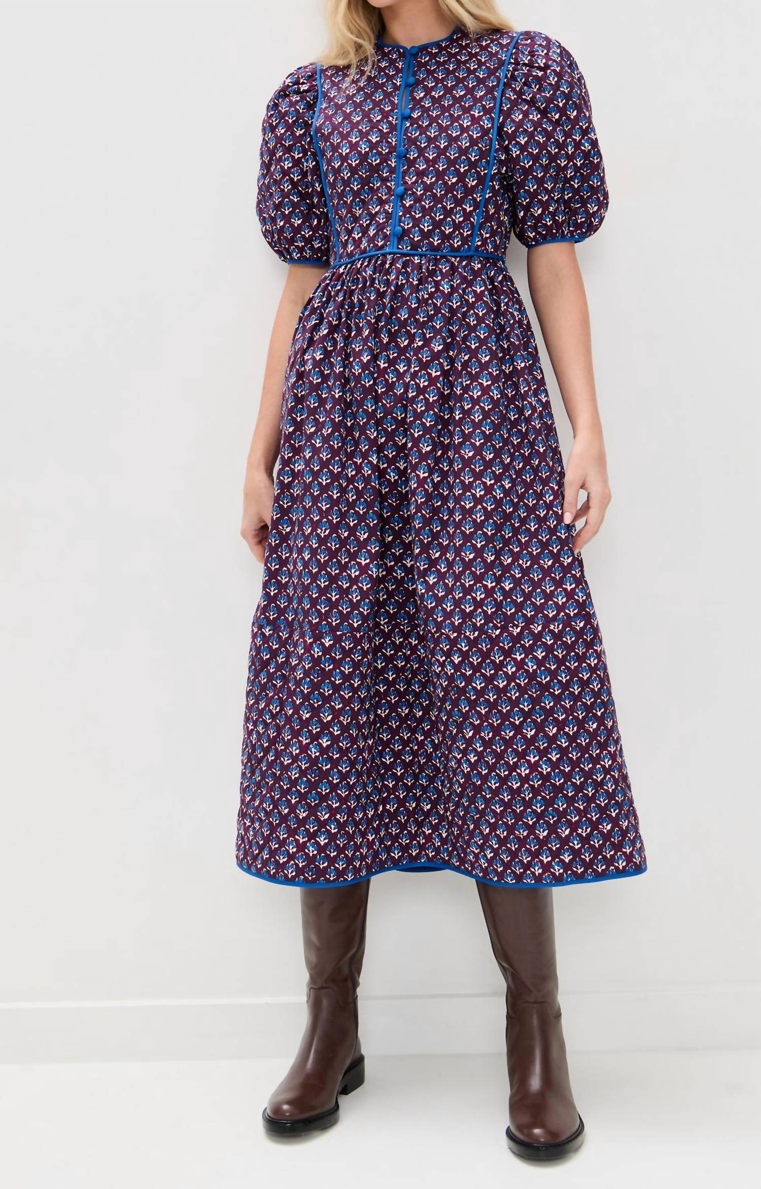 Just add slides or mules and you are good to go. The Brenner Midi Dress by Hunter Bell is a standout piece in Autumn Fleur Fig, designed for dinner parties or festive occasions. This A-line dress features a quilted pattern and short puff sleeves for an elegant touch. Made from 100% cotton, it includes a crew neck and midi-length cut, complete with on-seam side pockets. With a hook-and-eye and hidden zip closure at the back, this dress is imported from China and should be dry cleaned.
