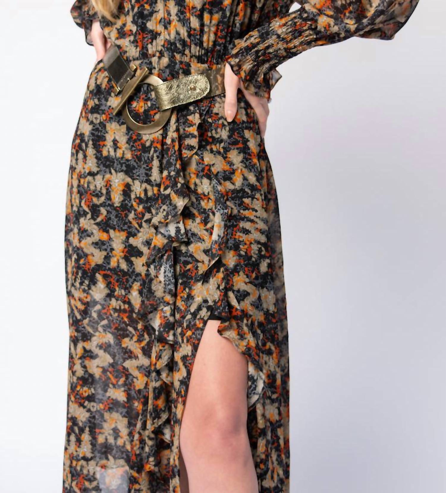 Just add slides or mules and you are good to go. Unveil your bohemian spirit with the Jorma Dress by IRO, a mid-length masterpiece in khaki black. This trendy, boho chic dress showcases long voluminous sleeves with smocked elasticated cuffs and a wrap silhouette, distinguished by a V-neckline and a ruffled side slit. Made from lightweight, slightly sheer fabric with an abstract pattern, it offers a vintage yet chic allure. Closure: Pull-on style. Care: Hand wash. This dress includes a detachable, loose-fitting slip for added versatility.