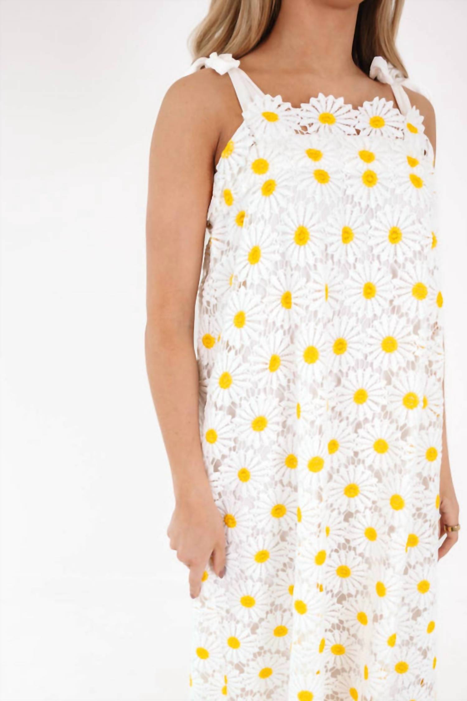 The perfect length dress does exist. Introducing the Sunny Sunflower Crochet Dress by J.Marie, a stunning sleeveless piece designed for standout style. This dress is crafted with a composition of 100% polyester with a 100% rayon lining, offering both elegance and comfort. The midi-length and charming tie closure add a touch of sophistication to your summer wardrobe. Perfect for Easter or a dinner party, this dress is a must-have for the season. Model is wearing a size x-small.