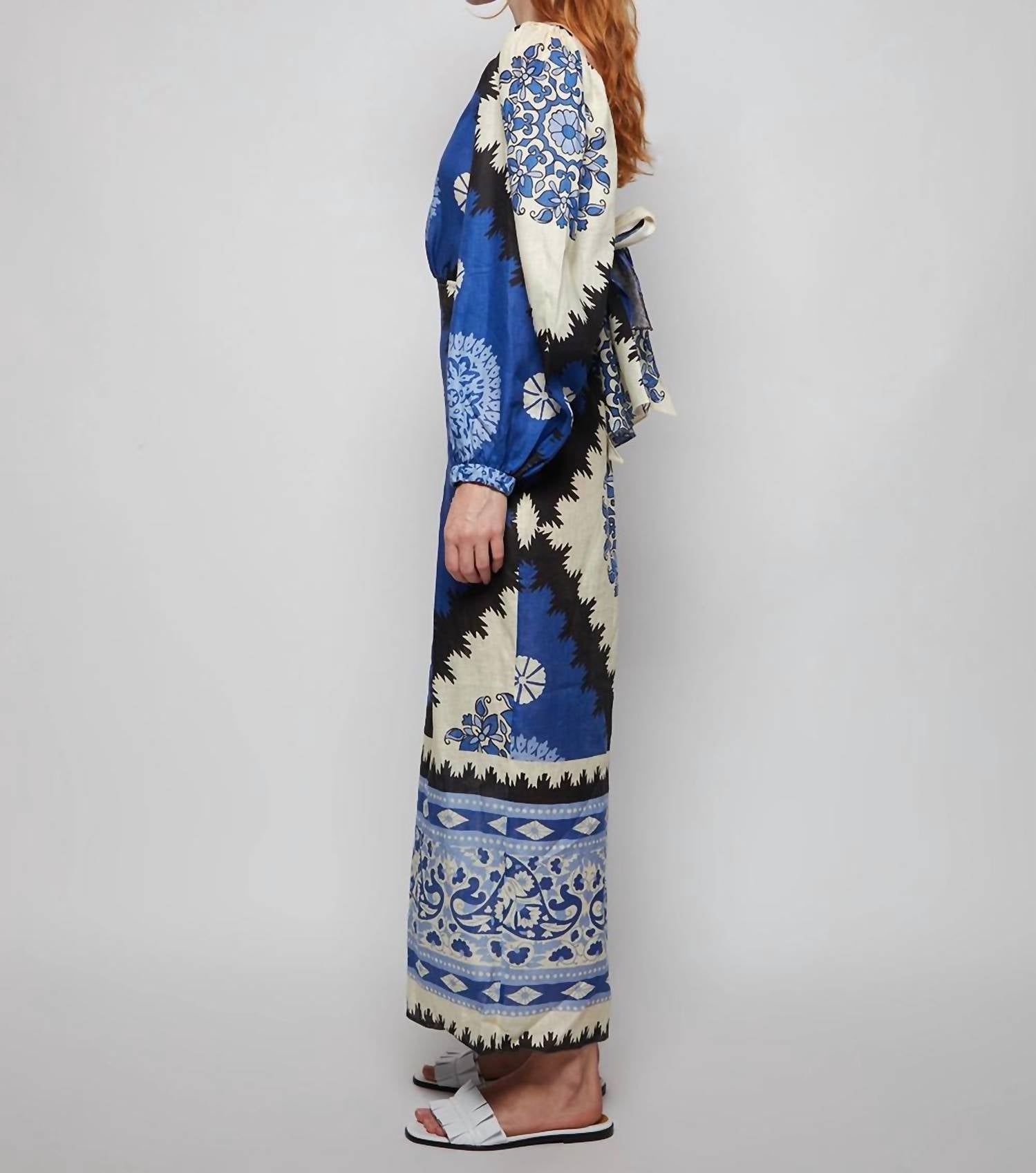 A midi dress so versatile, your options for wearing it are endless. Introducing the Glorious Rivers Midi Dress by Johanna Ortiz, a chic addition for your summer wardrobe. Designed with long puff sleeves and a bateau neckline, this blue dress features geometric patterns and an A-line silhouette for a casual yet stunning fit. Crafted from 100% linen, it boasts open sides, an open back with tie closure, and a back slit at the hem for added flair. Care for this piece by dry cleaning only.