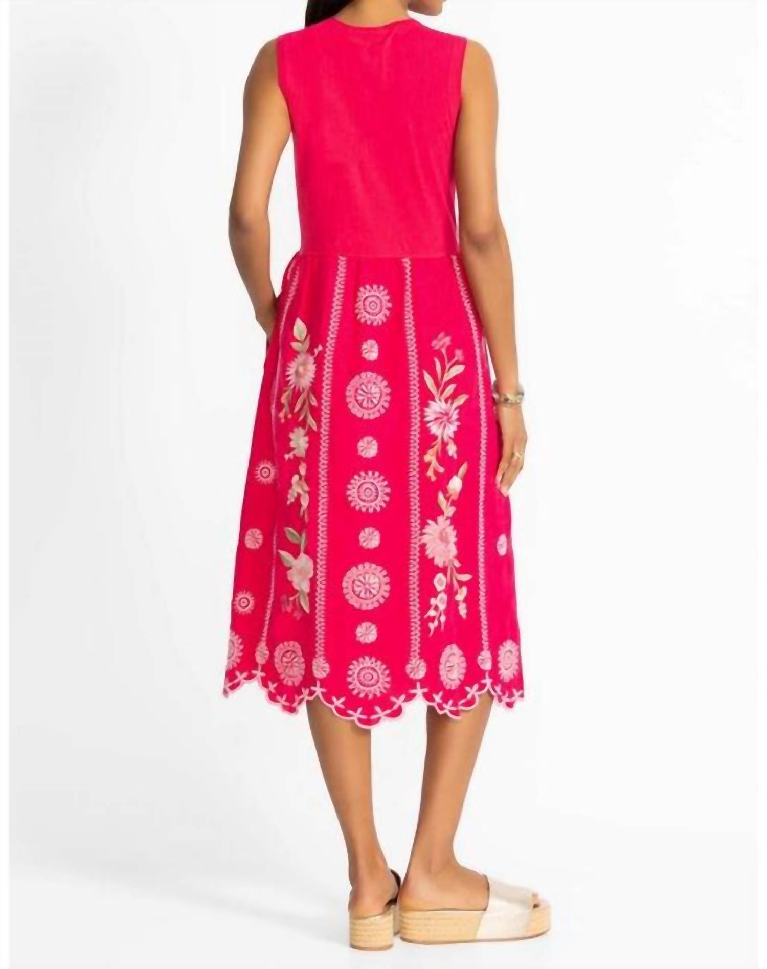 Just add slides or mules and you are good to go. The Mixed Media Tank Dress is crafted from 100% linen and combines brilliant florals with a rich backdrop. It is designed with a fitted tank at the bodice and an intricately embroidered skirt embellished with bold floral blooms. This vibrant dress is finished with pockets and a beautifully scalloped hemline. Model is wearing a size small. Machine Wash.