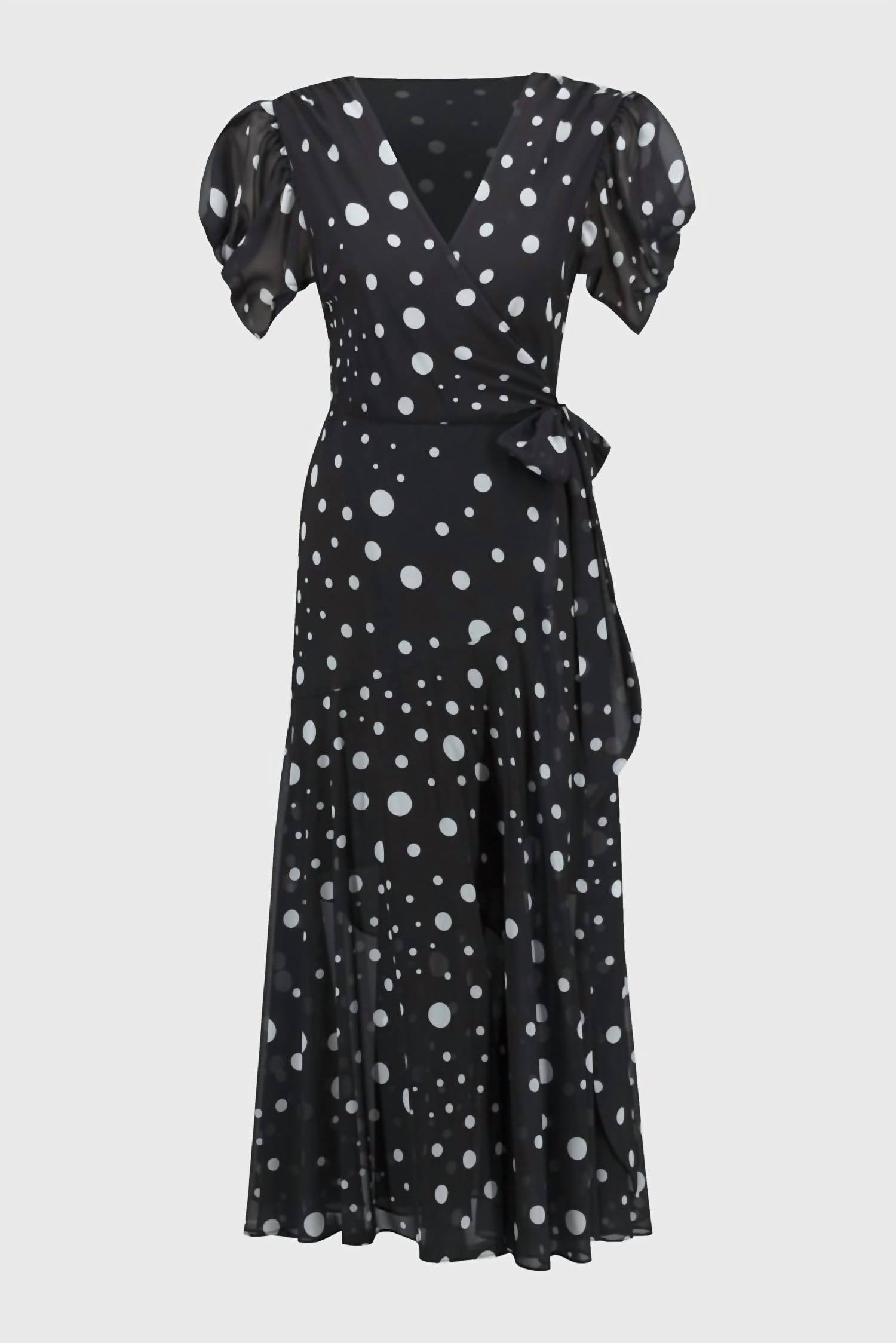 The perfect length dress does exist. Celebrate effortless style with the Joseph Ribkoff Chiffon Polka Dot Wrap Dress, a standout piece in a charming black-vanilla dotted print. This women's midi dress features short draped sleeves and a flattering V-neck, crafted from 100% polyester woven chiffon that beautifully drapes around you. Designed with a functional wrap and self-tie at the side, it promises both elegance and comfort for those memorable dinner parties. With its minimalist trend and ruffled hem, it's the perfect choice for springtime events.