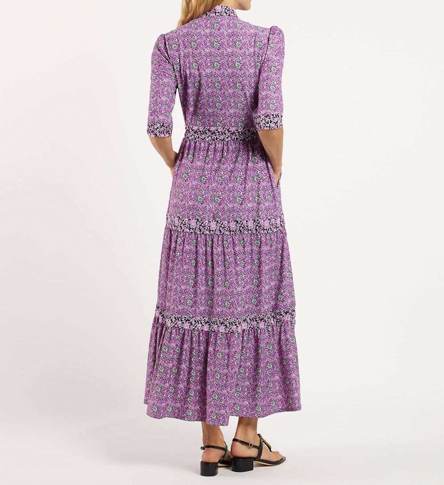 Just add slides or mules and you are good to go. Introducing the Candy Tiered Dress by JUDE CONNALLY, a charming addition to your summer wardrobe in a delightful Melody Ditsy Amethyst pattern. This midi-length dress is designed with three-quarter sleeves and a mandarin collar, featuring pockets for added convenience and contrasting tiers that enhance its A-line silhouette. Crafted from a nylon and spandex blend, it offers a comfortable and breathable fit. For easy care, simply machine wash and cool iron if necessary. Made in the USA, this dress is perfect for vacation or Mother's Day celebrations. Dimensions: 51 3/4" from top of center back (Size S).