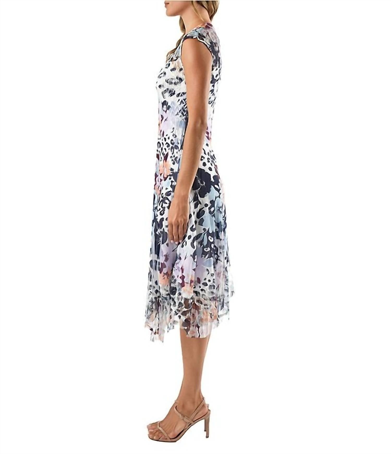 The perfect length dress does exist. Discover the Uneven Hem Chif Dress by Komarov, perfect for a spring holiday party with its exotic Hibiscus Leopard floral pattern. This A-line midi dress is crafted from lightweight polyester and features a flattering scoopneck design. Its sleeveless style offers a breezy elegance ideal for any festive gathering. Care instructions are not available for this piece.