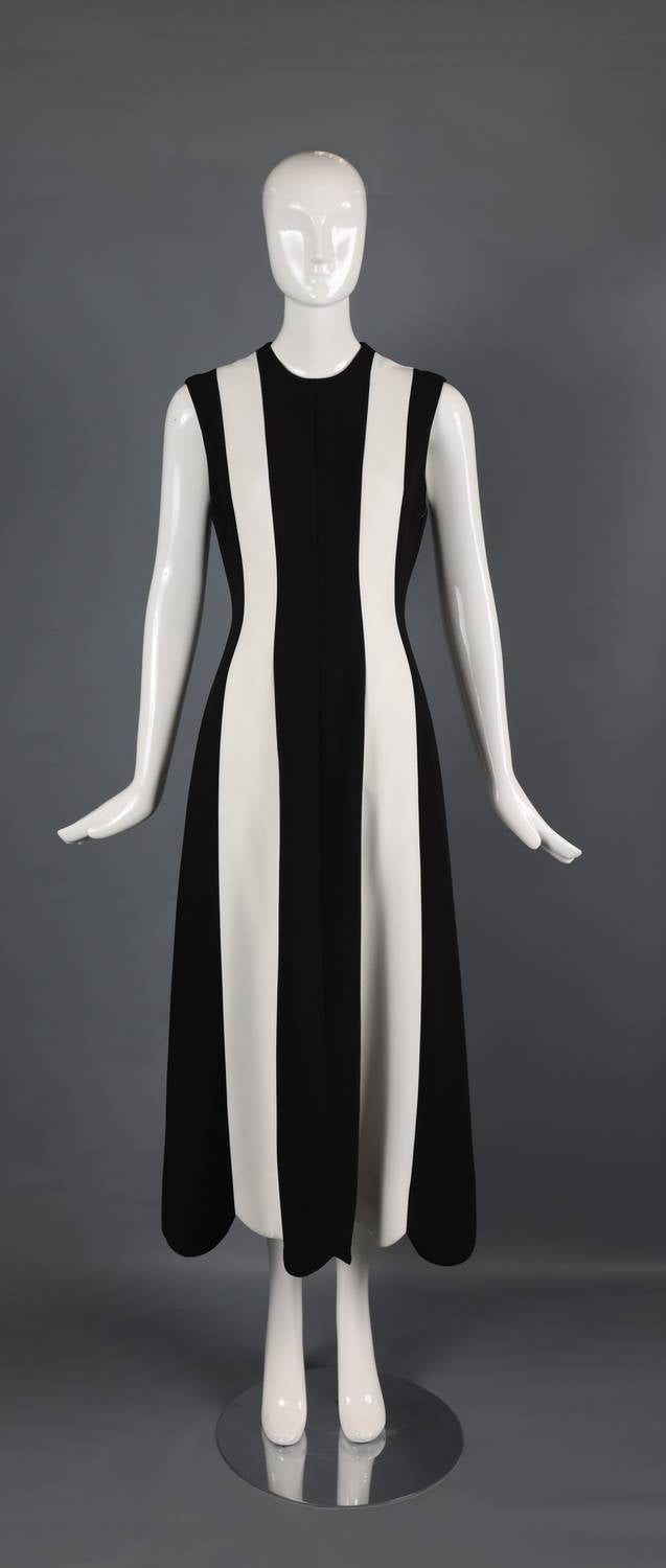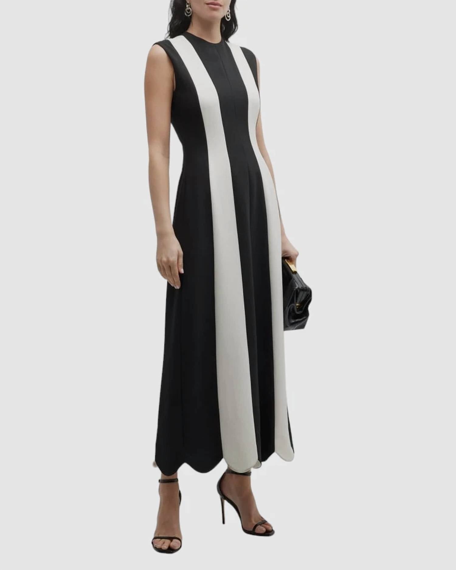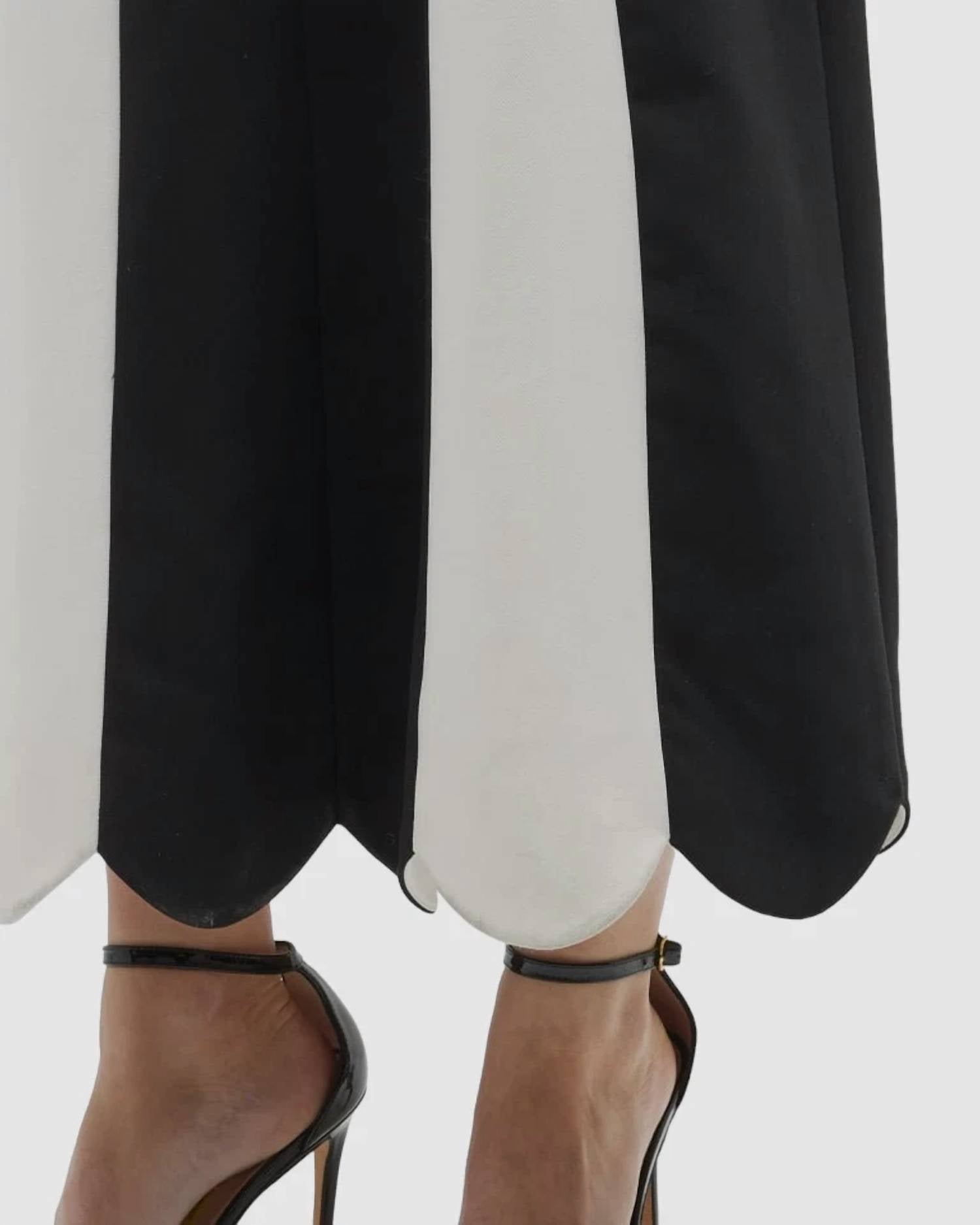 A midi dress so versatile, your options for wearing it are endless. Elevate your dinner party style with the Paneled Scallop-hem Midi Dress by Lela Rose, designed for an elegant statement. This sleeveless dress in chic black and white stripes features a jewel neck and a flattering A-line silhouette. Crafted from a luxe blend of 73% polyester, 20% viscose, and 7% elastane, it offers a comfortable fit and luxurious feel. The dress includes a hidden back-zip closure and is fully lined, with care instructions recommending dry cleaning to maintain its impeccable finish.