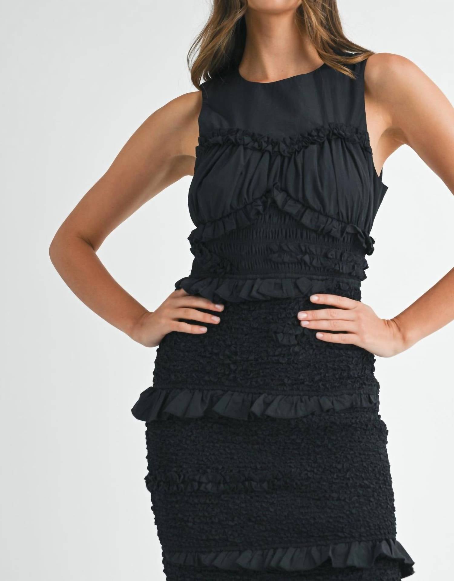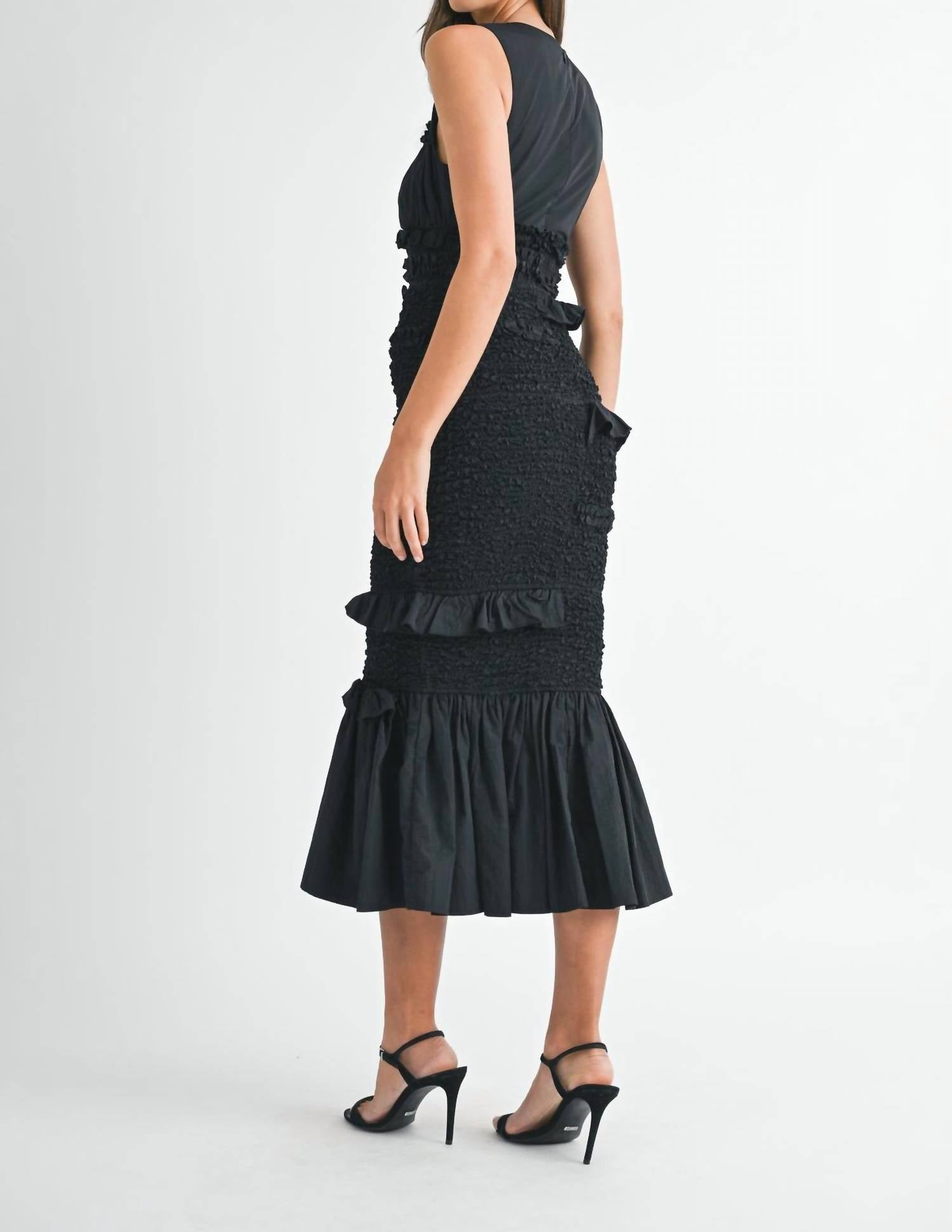 Just add slides or mules and you are good to go. Introducing the Smocked Verity Mermaid Line Midi Dress by MABLE, an elegant choice in classic black for any occasion. This sleeveless dress boasts a flattering textured bodice and mermaid silhouette, complete with ruffle detail for added charm. Crafted from durable nylon, the dress features a zip closure and flows gracefully to a midi length. Care instructions include hand washing to maintain its stunning appearance.