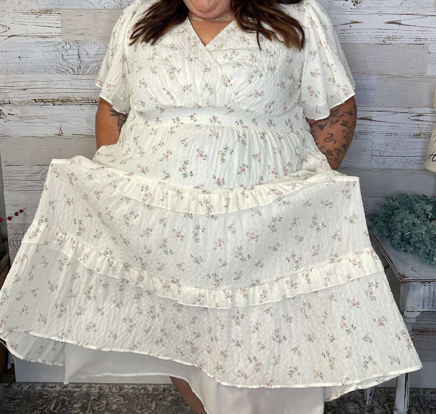 Just add slides or mules and you are good to go. Experience elegance with the Jessa Midi Dress by Mikarose, a perfect addition to any wardrobe. This enchanting piece features short flutter sleeves and a flattering V-neckline, crafted from 100% polyester in a charming white floral pattern. The dress is fully lined, boasting a feminine A-line silhouette with a natural waist and tiered skirt, ideal for any special occasion. Though 'care instructions' are not specified, Shanna showcases this piece beautifully in a size 3XL at 5'3".