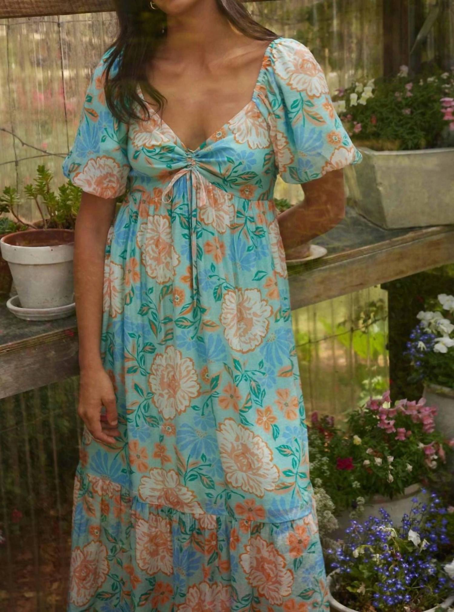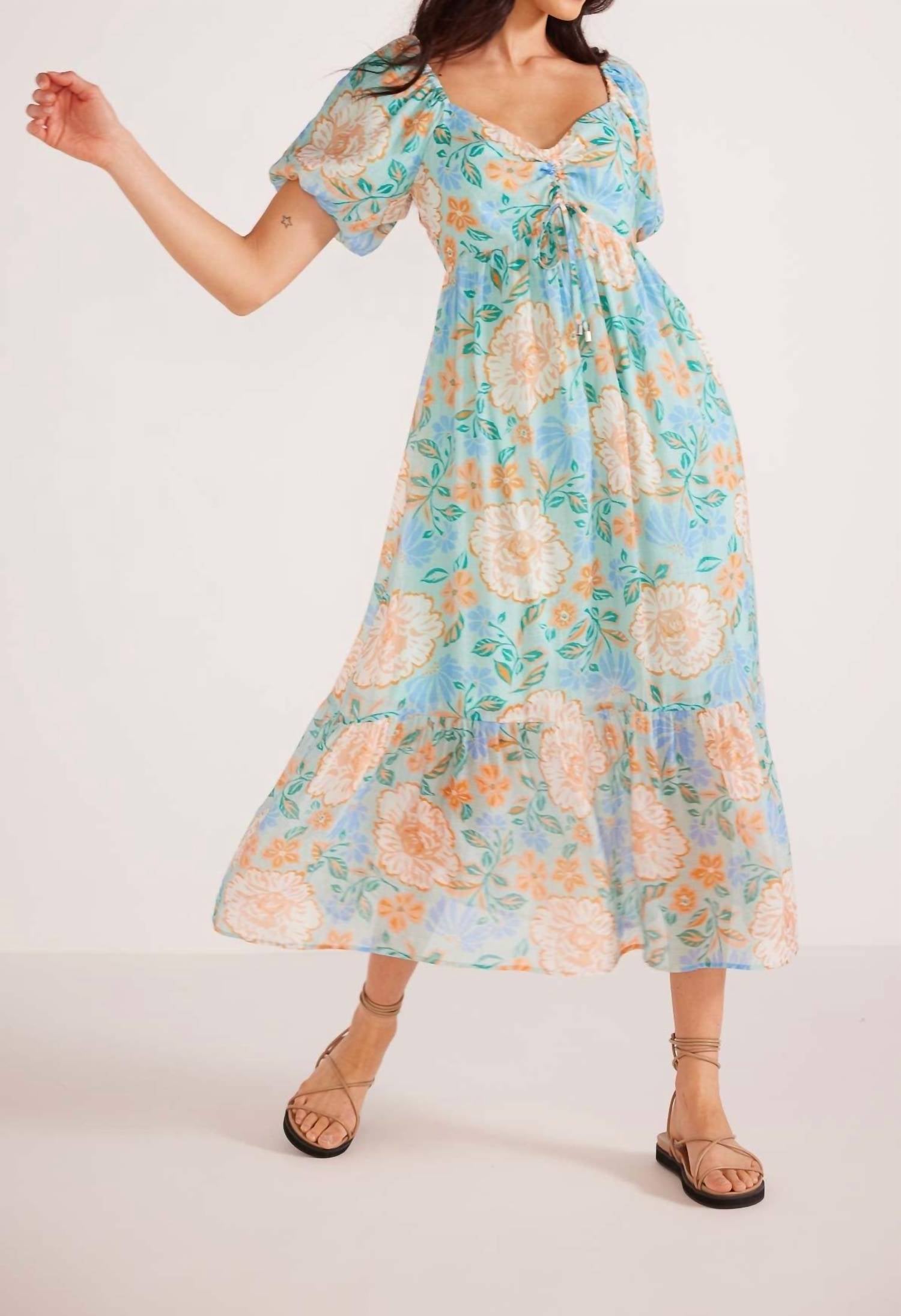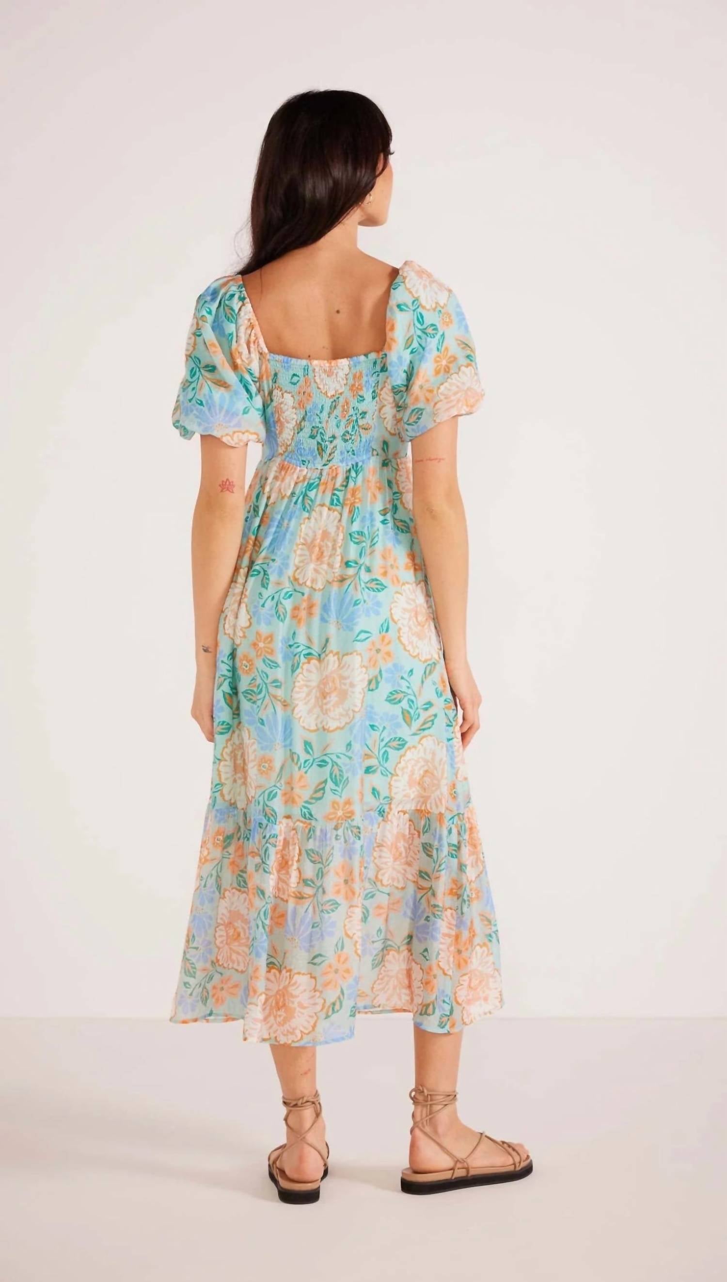 The perfect length dress does exist. Introducing the Evelyn Puff Sleeve Midi Dress by MINKPINK, an enchanting piece in a light blue floral pattern perfect for holiday parties and spring outings. With its short puff sleeves and sweetheart neckline featuring an adjustable gathered drawstring, this dress embodies whimsical elegance. Composition: 80% Viscose, 20% Polyamide. Closure: Pull on. Care: Handwash with mild soap in cold water, lay flat to dry. Model Jose is 176cm (5'9") tall and wears size S. Designed in Sydney, Australia, this midi-length dress aligns with 90s fashion trends, perfect for Easter celebrations.